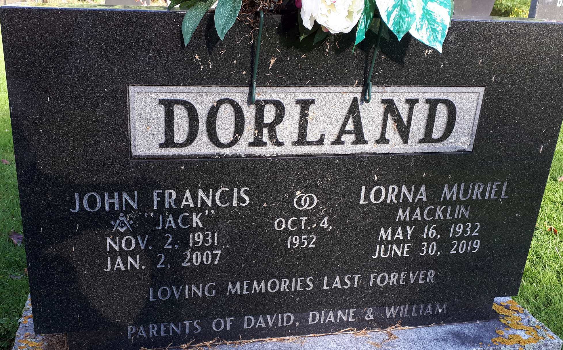 Date Jan 2 2007 per Memorial.2 He was buried on 5 January 2007 at McPhail's Cemetery, Brighton Twp., Northumberland Co., Ontario; Memorial: (See Exhibit) DORLAND; John Francis; "Jack"; Nov. 2, 1931; Jan. 2, 2007; Lorna Muriel; Macklin; May 16, 1932; June 30, 2019; Oct. 4, 1952; Parents of David, Diane & William (McPhail's Cemetery, Brighton Twp., Sep 29 2020, by Dan.)2