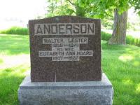 Walter Lester Anderson was born on 29 August 1856 at Sidney Twp., Hastings Co., Ontario; Date 1856 per Memorial. Date Aug 1857 & location Ont. per 1911 Census. Date Aug 29 1856 & location Ont. rural per 1901 Census. Date 1857 & location Ont. per 1891 Census. Date 1857 & location Ont. per 1881 Census. Date 1857 & location Ont. per 1871 Census. Date 1856 & location Ont. per 1861 Census. Per email from Dianne, July 14, 2002.1,2,3,4,5,6,7 He appeared on the census of April 1861 at Sidney Twp., Hastings Co., Ontario; Age 5 at 1861 Census: see Joshua S. Anderson.2 He appeared on the census of April 1871 at Sidney Twp., Hastings Co., Ontario; Age 14 at 1871 Census: see Joshua S. Anderson.2 He married Elizabeth Ann Hoard, daughter of Vernon Busman Hoard and Elizabeth Ann Bell, on 7 January 1878 at Seymour Twp., Campbellford, Hastings Co., Ontario; Marriage Reg'n.#007698: Groom: Walter L. Anderson; Age: 23; Res. & Born: Sidney; Status: bachelor; Occ.: farmer; Parents: Joshua & Mahala Anderson; Bride: Elizabeth Ann Hoard; Age: 23; Res. & Born: Seymour; Status: spinster; Parents: Vernon & Elizabeth Hoard; Wit.: Ephraim C. Janes, Campbellford; Date: Jan 7 1878; Place: Campbellford; Rel.: Ep. Meth; Performed by: R. Janes?; Reg'r.: C. Kennedy (Ontario Marriage Registration, #007698-1878, ancestry.com) per 1891 Census.3,8 Walter Lester Anderson appeared on the census of April 1881 at Sidney Twp., Hastings Co., Ontario; Age 24? at 1881 Census: Anderson, Walter, 24, b. Ont., Scot., Meth., farmer, married; Elizabeth, 22?, b. Ont., Dutch, Meth., married; Gordon, 6/12, b. Ont., Scot. (1881 Census Online: Sidney Twp., pg. 69 of 101, pg. 32, line 25.)4 He appeared on the census of April 1891 at Sidney Twp., Hastings Co., Ontario; Age 34 at 1891 Census: Anderson, Walter, 34, b. Ont., p.b. Ont., Meth., farmer, married; Ann, 33, b. Ont., p.b. Ont., Meth., married; Gordon, 10; Edith, 8; Ross, 1 (1891 Census Online: Sidney Twp., dist. 75, sub-dist. c, pg. 23, line 8 - ancestry.com.)3 He appeared on the census of April 1901 at Seymour Twp., Northumberland Co., Ontario; Age 44 at 1901 Census: Anderson, Lester W., 44, b. Ont. r. Aug 29 1856, Scot., Meth., farmer, married; Elizabeth A., 44, b. Ont. r. Mar 18 1857, Eng., Meth., married; Gordon, 20, b. Ont. r. Oct 15 1880, Scot., son; Edith C., b. Ont. r. May 24 1882, daughter; Ross V., 11, b. Ont. r. Oct 4 1889, son; Arthur J., 8, b. Ont. r. Mar 27 1893, son; AAron S., 4/12, b. Ont. r. Dec 21 1900, son (1901 Census Online: Seymour Twp., dist. 95, sub-dist. i-4, pg. 8, line 7, T-6485 - Conc 2, Lot 5.)6 He lived in April 1901 at Conc 2 Lot 25, Seymour Twp., Northumberland Co., Ontario; Residence per 1901 Census: Conc 2, Lot 25, Seymour Twp.6 He appeared on the census of 1911 at Seymour Twp., Northumberland Co., Ontario; Age 54 at 1911 Census: Anderson, Lester, 54, b. Ont. Aug 1857, Scot., Meth., farmer, married; Elizabeth A., 54, b. Ont. Mar 1857, Dutch, Meth., married; Ross V., 22, b. Ont. Oct 1889, Scot., son; Arthur, 18, b. Ont. Mar 1893, son; Aaron J.?, 10, b. Ont. Dec 1901, son (1911 Census Online: Seymour Twp., dist. 101, sub-dist. 28, pg. 5, line 24 - Conc 2, Lot 25.)7 He lived in 1911 at Conc 2 Lot 25, Seymour Twp., Northumberland Co., Ontario; Residence per 1911 Census: Conc 2, Lot 25, Seymour Twp.7 He lived on 19 November 1927 at Seymour Twp., Hoards Station, Northumberland Co., Ontario; Informant for Death Reg'n. of his wife Elizabeth Ann (Hoard) Anderson.9 He died on 12 November 1941 at Ontario at age 85; Date 1941 per Memorial. Date Nov 12 1941 per GEDCOM of zacky16, July 2, 2009.1,10 He was buried on 14 November 1941 at Hoard's United Church Cemetery, Seymour Twp., Northumberland Co., Ontario; Memorial: (See Exhibit) ANDERSOM; Walter Lester; 1856 - 1941; His Wife; Elizabeth Ann Hoard; 1857 - 1927 (Hoard's United Church Cemetery, Seymour Twp., pic sent to my by Jim Belford, June 2009.)1