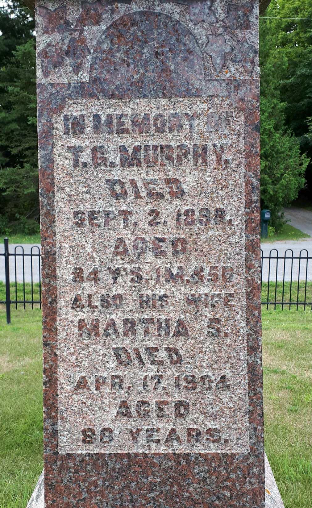 Deborah had married James Thomas Walker on Mar 16/1864. Lydia had married Robert Austin Brintnell on Mar 6/1879." per email from Patrick Goodmurphy, Jan 23 2024.9 He lived on 28 August 1897 at Village Lot 5, Main St. North, Brighton, Northumberland Co., Ontario; Land Registry Records (Grant 3333) show that Thomas G. Murphy sold Village Lot 5, North Side of Main St., Village of Brighton, Northumberland Co. to Lydia L. Brintnell for $800. ITS Date: Aug 28 1897. Reg'n. Date: Jan 7 1898. (Ontario Land Registry Records, Northumberland Co., Brighton Village, Book 004, Pg. 293 of 399, Village Lot 5, North side of Main, page copied from OnLand.ca by Dan Buchanan Apr 13 2023.)9 He lived on 28 August 1897 at Village Lot 6, Main St. North, Brighton, Northumberland Co., Ontario; Land Registry Records (Grant 3333) show that Thomas G. Murphy sold Village Lot 6, North Side of Main St., Village of Brighton, Northumberland Co. to Lydia L. Brintnell for $800. ITS Date: Aug 28 1897. Reg'n. Date: Jan 7 1898. (Ontario Land Registry Records, Northumberland Co., Brighton Village, Book 004, Pg. 295 of 399, Village Lot 6, North side of Main, page copied from OnLand.ca by Dan Buchanan Apr 13 2023.)9 He died on 2 September 1898 at Brighton Twp., Northumberland Co., Ontario, at age 84; Death Reg'n.#010506: Name: Thomas G. Murphy; Date: Sep 2 1898; Age: 84; Res.: Conc 1 Lot 7, Percy Twp; Occ.: gentleman; Born: Ireland; Cause: old age; Phys.: J. M. Clemminson MD; Rel.: Meth; Inf.: George Murphy; Reg'd; Sep 2 1898; Reg'r.: R. P. Hurlbut, Percy Twp. (Ontario Death Registration, #010506-1898, ancestry.ca) Date Sep 2 1898 & location Brighton per family tree of 1_janethughed10 on ancestry.ca, Aug 13 2018.5,11 He was buried on 4 September 1898 at Waite Cemetery, Cramahe Twp., Northumberland Co., Ontario; Memorial: (See Exhibits) In Memory of; T. G. Murphy; Died; Sept. 2, 1898; Aged; 84 Y's, 1 M, & 5 D; Also His Wife; Martha S; Died; Apr. 17, 1904; Aged; 86 Years (Waite Cemetery, Cramahe Twp., Aug 7 2018.)1
