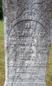 CemSearch: Name: Edmond Thorne; Born: - ; Died: Oct 17 1869; Age: 60; ID: WAITE083; Other names: Thorne, Amelia ( -1898); Cemetery: Waite Cemetery, Conc 4 Lot 11, Cramahe Twp., Sec A-W Row 1 Plot 10 (https://www.cemsearch.ca/burial/?pid=WAITE083%5E0.)3,4