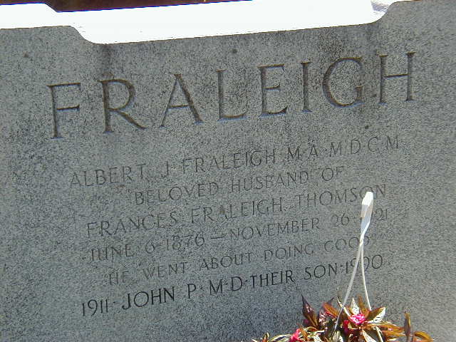 He was buried in 1990 at Glenwood Cemetery, Picton, Prince Edward Co., Ontario; Memorial: (see Exhibit) FRALEIGH; Albert J. Fraleigh, M. A, M. D., C. M; Beloved Husband of; Frances Fraleigh Thomson; June 6 1876 - Nov 26 1921; He Went About Doing Good; 1911 John P. M. D. Thier Son 1990 (Sec E, Glenwood Cemetery, Picton, Aug 24, 2003.)1 He died in 1990; per "Fraleigh Family History 1650 - 1993", Researched & written by Charles H. Fraleigh, Co-written & edited by D. Fraleigh; photocopy sent to me Aug 6, 2002 by Chick Cornell.