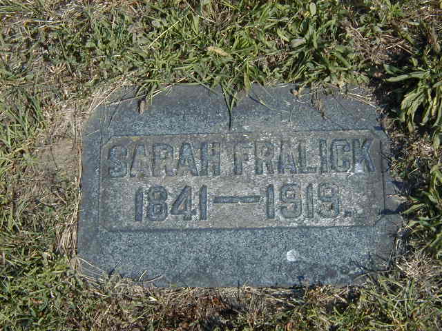 Sarah Lambert was born on 20 June 1841 at Prince Edward Co., Ontario; Date 1842 & location per Death Reg'n. Date per IGI Record - . Date and place per 1861 Census. I wrote down 1841 - can't be?? per Chart in Fralick file in L & A Archives, Napanee, transcribed July 25, 2002.1 As of 19 December 1859,her married name was Fralick. She married Jacob Fralick, son of Jonathan Freleigh and Charlotte Griffith, on 19 December 1859 at Prince Edward Co., Ontario; Date per IGI Record. per Chart in Fralick file in L & A Archives, Napanee, transcribed July 25, 2002. Sarah Lambert appeared on the census of April 1861 at Athol Twp., Prince Edward Co., Ontario; Age 20 at 1861 Census: see Jacob Fraleigh.2 She appeared on the census of April 1871 at Athol Twp., Prince Edward Co., Ontario; Age 30 at 1871 Census: see Jacob Freleigh.3 She appeared on the census of April 1881 at Hallowell Twp., Prince Edward Co., Ontario; Age 40 at 1881 Census: see William Fraleigh.4 She died on 9 March 1919 at Athol Twp., Prince Edward Co., Ontario, at age 77; Death Reg'n.: Name: Sarah Fralick; Died: Mar 9 1919; Age: 77y; Status: widow; Born: P. E. Co; Res.: Lot 3, Conc 2?, East Lake, Athol; Parents: Henry Lambert & ? ; Dr.: A. W. Heaslip; Inf.: W. H. McDonald, Picton
