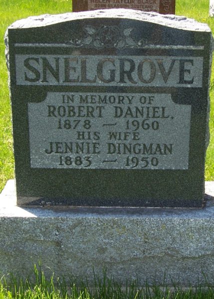 Jennie B. Dingman was born in 1883 at Seymour Twp., Meyersburgh, Northmberland Co., Ontario; Date 1883 per Memorial. Date 1883 & location Ont. per 1891 Census. Date and location per marriage reg'n.1,3,2 She appeared on the census of April 1891 at Campbellford, Northumberland Co., Ontario; Age 8 at 1891 Census: see Henry Dingman.4 She lived on 18 December 1901 at Campbellford, Northumberland Co., Ontario; Witness at marriage of her sister Lillian. As of 26 November 1902,her married name was Snelgrove.5 She married Robert Daniel Snelgrove, son of Thomas "Abel" Snelgrove and Hester Elizabeth "Eliza" Vincent, on 26 November 1902 at Campbellford, Northumberland Co., Ontario; Marriage Reg'n.#012507: Groom: Robert D. Snelgrove; Age: 23; Res. & Born: Brighton Twp; Status: bachelor; Occ.: barber; Parents: Abel Snelgrove & Eliza Vincent; Bride: Jennie B. Dingman; Age: 20; Res.: Campbellford; Born: Marysburgh??; Status: spinster; Parents: S. H. Dingman & Catherine Simmons; Witnesses: F. F. Snelgrove, Brighton; F. M. McAdam, Campbellford; Date: Nov 26 1902; Place: Campbellford; Rel.: Pres. & Angl; Performed by: A. J. Reid, Campbellford (Ontario Marriage Registration, #012507-1902, ancestry.ca.)5 Jennie B. Dingman was buried in 1950 at Little Lake Cemetery, Peterborough, Peterborough Co., Ontario; Memorial: (See Exhibit) SNELGROVE; In Memory of; Robert Daniel; 1878 - 1960; His Wife; Jennie Dingman; 1883 - 1950 (Little Lake Cemetery, Peterborough - image sent to me via email by Linda Park, May 17 2010.)1 She died in 1950 at Ontario; Date 1950 per Memorial.1