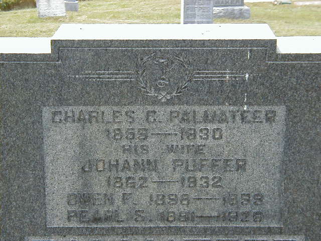 Cemetery Transcription: Charles C. Palmateer; 1859 - 1930; His Wife; Johann Puffer; 1862 - 1932; Owen F. 1896 - 1899; Pearl S. 1881 - 1926 (picture - in Christian Church Cemetery Book, Ruth & Emerson Smart's Books, Jan 15, 2004.