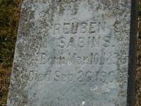 Reuben John Sabins was born on 10 March 1836 at Upper Canada; Date Mar 10 1836 per Memorial. Date Mar 10 1836 per email from Mallory Smith, Dec 5, 2005. Date 1836 & location Ontario per 1881 Census. Date 1836 per 1851 Census.4,2,1,5 He appeared on the census of 1851 at Cramahe Twp., Northumberland Co., Canada West; Age 15 at 1851 Census: see Daniel Sabins.6 He married Mary Swann, daughter of Robert Swann and ? ?, before 1859 at Cramahe Twp., Northumberland Co., Canada West; per 1881 Census.4 Reuben John Sabins appeared on the census of April 1861 at Cramahe Twp., Northumberland Co., Canada West; Age 26 at 1861 Census: Sabins, Reuben, 26, b. CW, EM, farmer, married; Mary, 19, b. CW, EM, married; Effy, 1.7 He lived in April 1871 at Conc 7 Lot 15, Cramahe Twp., Northumberland Co., Ontario; Residence per 1871 Census: Conc 7, Lot 15, 35 acres, owner.8 He appeared on the census of April 1871 at Cramahe Twp., Northumberland Co., Ontario; Age 35 at 1871 Census: Sabins, Rueben, 35, b. Ont., Ger., EM, farmer, married; Mary, 28, b. England, Eng., EM, married; Effie, 11, b. Ont., Ger; ??(f), 9; Ida, 3 (Cramahe, div. 3, pg. 30, line 13 - Conc 7, Lot 15, 35 acres, owner.)8 He appeared on the census of April 1881 at Cramahe Twp., Northumberland Co., Ontario; Age 45 at 1881 Census: Sabins, Reulin, 45, b. Ont., Eng., EM, farmer, married; Mary, 38, b. England, EM, married; Ann, 21, b. Ont., Eng., EM; Adla A., 19; Ida May, 13; John Stanley, 8; William E., 6; Lucy Grace, 6 months - Oct. (familysearch.org.)4 He died on 26 September 1906 at Ontario at age 70; Date Sep 26 1906 per Memorial. Date Sep 26 1906 per IGI Record.9,5 He was buried on 28 September 1906 at Stone's Cemetery, Percy Twp., Northumberland Co., Ontario; Memorial: (See Exhibit) Rueben; Sabins; Born Mar 10, 1836; Died Sep 26 1906 (Stone's Cemetery, Percy Twp., June 25 2007.)5
