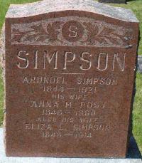 Arundel Ramsay Simpson was born on 7 March 1844 at Cramahe Twp., Northumberland Co., Canada West; Date Mar 1844 & location Brighton per Death Reg'n. Date Mar 1845 & location Ont. per 1911 Census. Date Mar 7 1845 & location Ont. rural per 1901 Census. Date 1849 & location Brighton per marriage reg'n. - Adde Young. Date Mar 1844 per email from Naomi Pinn, Dec. 1, 2004. Date 1844 per 1881 Census. Date 1841 Per 1851 Census.1,2,7,8,5,4 He appeared on the census of March 1852 at Brighton Twp., Northumberland Co., Canada West; Age 10 at 1851 Census: see Obediah Simpson.9 He appeared on the census of April 1861 at Brighton Twp., Northumberland Co., Canada West; Age 19 at 1861 Census: see Obed Simpson.10 He married Anna Maud "Minnie" Post, daughter of Isaac C. Post and Jemima Parliament, on 25 February 1868 at Brighton Twp., Northumberland Co., Ontario; Marriage Register: Groom: Randal Simpson; Age: 24; Res. & Born: Northumberland Township; Parents: Obediah & Mary Simpson; Bride: Anna Post; Age: 22; Res.: Northumberland Township; Born: Prince Edward Co; Parents: Isaac & Jemima Post; Date: Feb 25 1868; Place: Northumberland Co. (Ontario Marriage Registers, ancestry.com.)6 Arundel Ramsay Simpson lived in April 1871 at Conc BF Lot 6, Brighton Twp., Northumberland Co., Ontario; Residence per 1871 Census: Conc F (Broken Front), Lot 6, tenant. He appeared on the census of April 1871 at Brighton Twp., Northumberland Co., Ontario; Age 26 at 1871 Census: Simpson, Randall, 26, b. Ont., Pres., Dutch, farmer, married; Anna M., 23, b. Ont., married; Darwin, 3; Delmer, 1 (Conc F, Lot 6, tenant.)11 He married Eliza Leisha Simpson, daughter of George Benedict Simpson and Sarah Ann Swetman, on 30 November 1880 at Colborne, Northumberland Co., Ontario; Marriage Reg'n.#057028: Groom: Arundel R. Simpson; Age: 36; Res. & Born: Brighton Twp; Status: bachelor; Occ.: farmer; Parents: Obed & Mary Simpson; Bride: Elizabeth Simpson; Age 32; Res. & Born: Brighton Twp; Parents: George & Sarah Ann Simpson; Wit.: Sarah & John Hare, Brighton; Date: Nov 30 1880; Place: Colborne; Rel.: Pres; Performed by: Reb. P. Duncan; Reg'r.: A. Vas, Colborne (Ontario Marriage Registration, #057028-1880, ancestry.com)