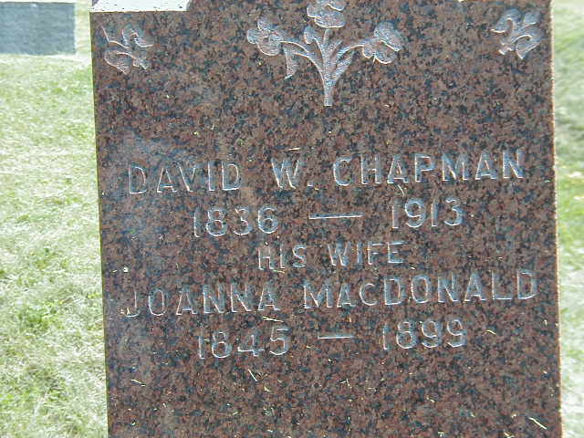 "DIED; Chapman. In Kingston, on Friday, July 31st, 1914, David W. Chapman, aged 79 years. The funeral service was held in the Presbyterian church, Brighton, on Monday, Aug. 3rd, and interment took place at Mount Hope cemetery." from pg. 015 of Newspaper Clippings, a collection donated by Shawnee Spencer to the Brighton Digital Archives, 2022.13,14,15 He was buried on 3 August 1914 at Mount Hope Cemetery, Brighton, Northumberland Co., Ontario; Memorial: (See Exhibit) David W. Chapman; 1836 - 1913; His Wife; Joanna MacDonald; 1845 - 1899 (Mount Hope Cemetery, Brighton, July 10, 2004)