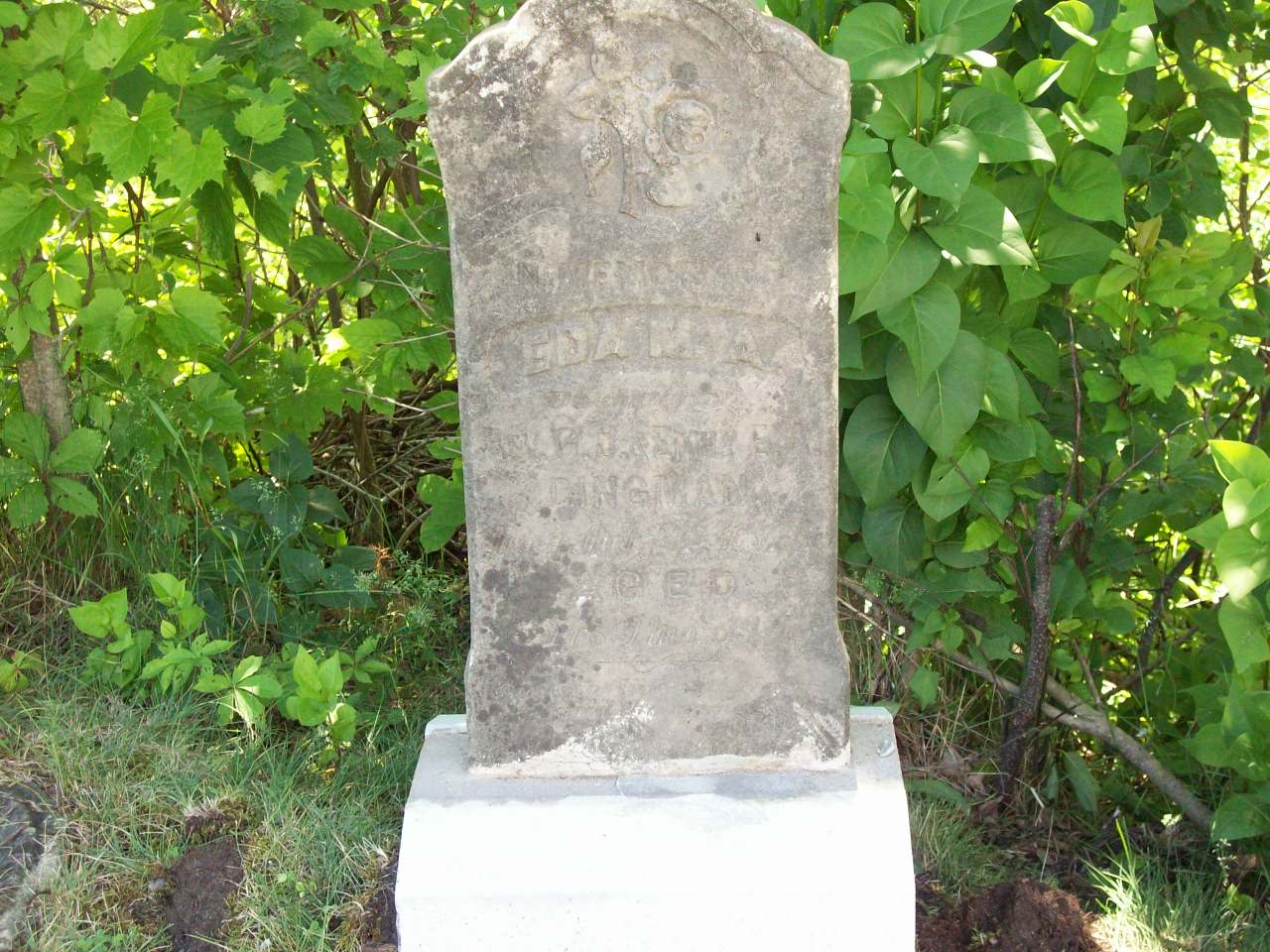 Eda Mary A. Dingman was born in July 1873 at Hillier Twp., Wellington, Prince Edward Co., Ontario; Location per Death Reg'n. Per Burial. He died on 27 October 1876 at Cramahe Twp., Castleton, Northumberland Co., Ontario, at age 3; Death Reg'n.: Name: Eda M. A. Dingman (male); Died: Oct 27 1876; Age 3yr 9m; Born: Wellington, P. E. Co; Died: Cramahe Twp; Cause: diptheria; Reg'd.: Nov 1 1876; Dr.: J. B. Clark?; Inf.: G. J. Dingman, Castleton; Reg'r.: J. E. Pannock, Cramahe.3 He was buried on 29 October 1876 at Mount Hope Cemetery, Brighton, Northumberland Co., Ontario; CEMSearch: Name: Edna M. A. Dingman; Born: - ; Died: 1876-10-27; Age: 3y 3m; Notes: Daughter of Rev. G. J. & Emily E. Dingman; Buried: Mount Hope Cemetery, Brighton, Sect 1, Row 22; No other names.