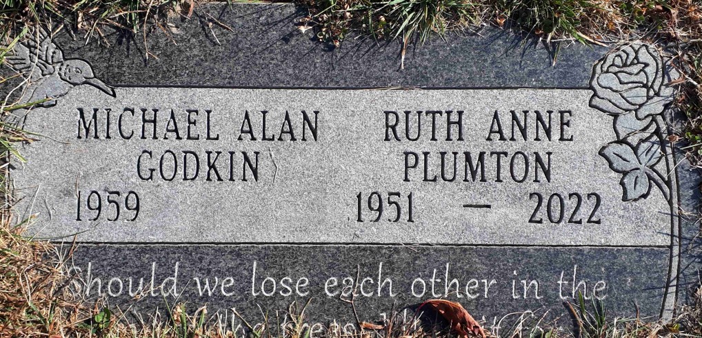 Date 2022 per Memorial.1 She was buried on 3 March 2022 at McPhail's Cemetery, Brighton Twp., Northumberland Co., Ontario; Memorial: (see Exhibit) Michael Alan; Godkin; 1959 - ; Ruth Anne; Plumton; 1951 - 2022 (McPhail's Cemetery, Brighton Twp., image by Dan Buchanan, Oct 1 2023.)1