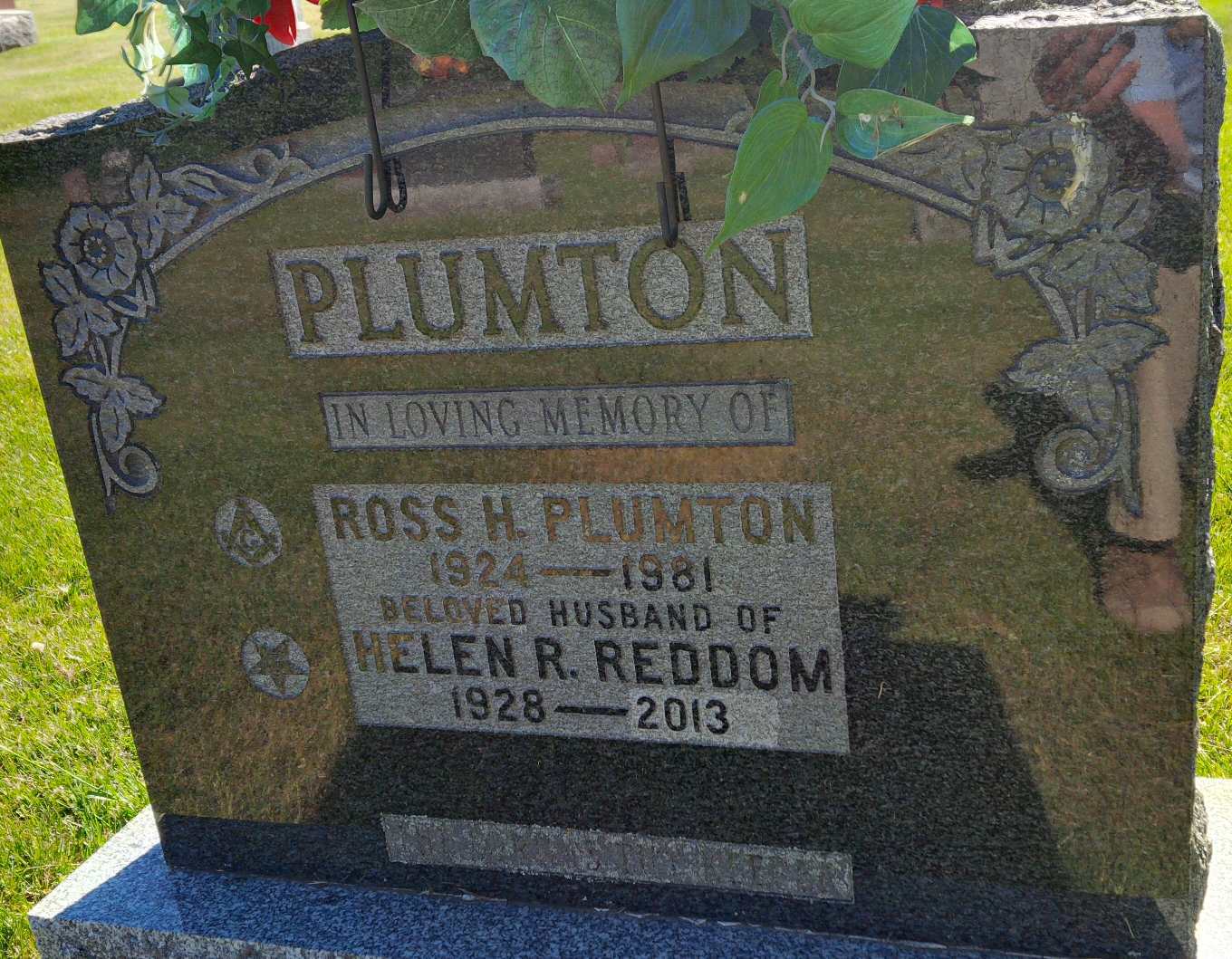 Ross Herman Plumton was born on 1 October 1924 at Brighton Twp., Northumberland Co., Ontario; Date 1924 per Memorial. Date Oct 1 1924 per Death Notice.2 He married Helen Ruth Reddom, daughter of Harry Morton Reddom and Florence Matilda "Flossie" McComb, in 1947 at Brighton Twp., Northumberland Co., Ontario; " .. Ross H. Plumton and Helen R. Reddom .. " Marriages, Wooler Pastoral Charge, 1947, W. T. R. Delve (Tweedsmuir Histories, Reel 1, I197)