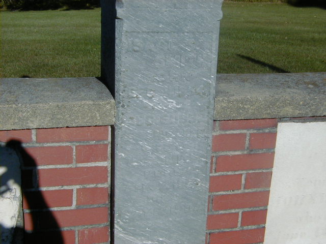 Note: Not sure if this is correct parents for this Isaac???2,3,1,4,5,6 He appeared on the census of April 1861 at Brighton Twp., Northumberland Co., Ontario; Age 6 at 1861 Census: see Robert Smith.2 He appeared on the census of April 1871 at Brighton Twp., Northumberland Co., Ontario; Age 16 at 1871 Census: see Robert Smith.4 He married Amanda Lee, daughter of Joseph Lee and Emma Nichols Flindall, before 1878 at Northumberland Co., Ontario; per 1901 Census.3 Isaac S. Smith appeared on the census of April 1881 at Brighton Twp., Northumberland Co., Ontario; Age 27 at 1881 Census: see Robert Smith.5 He lived in April 1901 at Conc A Lot 23, Brighton Twp., Northumberland Co., Ontario; Residence per 1901 Census: Conc A, Lot 23, Block L, Brighton Twp.3 He appeared on the census of April 1901 at Brighton Twp., Northumberland Co., Ontario; Age 45 at 1901 Census: Smith, Isaac, 45, b. Ont. Dec 1 1854, Eng., Meth., farmer, married; Amanda, 47, b. Ont., Apr 15 1853, Eng., Meth., married; Robert, 21, b. Jul 12 1879, son; Lizzie, 17, b. Sep 8 1883, daughter; Clara, 13, b. Oct. 5, 1887, daughter; Lee, 7, b. Sep 1 1893, son (1901 Census Index & Image on Archives Canada web site: dist. 95, a-2, pg. 12, line 37, T-6485; Conc A, Lot 23, Block L.)3 He lived on 28 October 1916 at Brighton Twp., Smithfield, Northumberland Co., Ontario; Informant for Death Reg'n. of George Smith.7 He appeared on the census of 7 June 1921 at Brighton Twp., Smithfield, Northumberland Co., Ontario; Age 66 at 1921 Census: Smith, Isaac, 66, b. Ont., p.b. Ont., Scot., Meth., farmer, widower; Robert, 42, b. Ont., p.b. Ont., Scot., Meth., farmer, son, married; Bertha, 35, b. Ont., p.b. Ont., Scot., Meth., dau.-in-law, married; Marion(f), 6/12, grand-dau. (1921 Census: Brighton Twp., Northumberland Co., dist. 107, sub-dist. 3, pg. 5, line 28 - Smithfield Village - ancestry.ca.)6 He died on 6 December 1932 at Brighton Twp., Smithfield, Northumberland Co., Ontario, at age 78; Date Dec 6 1932 per Burial.1 He was buried on 8 December 1932 at Smith Cemetery, Brighton Twp., Smithfield, Northumberland Co., Ontario; Memorial: (See Exhibit) Isaac S; Smith; Born; Dec 1 1854; Died: Dec 6 1932; Aged; 78y & 5 Dy's; Amanda Lee; Wife of; I. S. Smith; Born; Apr 23? 1855; Died; May 12? 1904 (Smith Cemetery, Smithfield, Sept. 23, 2005)
