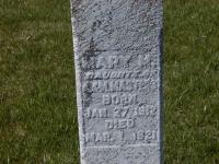 Date Mar 1 1921 per Memorial & CEMSearch. per GEDCOM of Karen Black, Nov 15, 2002.2,3,4,5 She was buried on 3 March 1921 at Wooler Friends Cemetery, Brighton Twp., Northumberland Co., Ontario; Memorial: (See Exhibit) Mary M; Daughter of; A. & M. Masters; Born; Jan 27 1912; Died; Mar 1, 1921 (Wooler Friends Cemetery, Brighton Twp., Apr 28 2007)