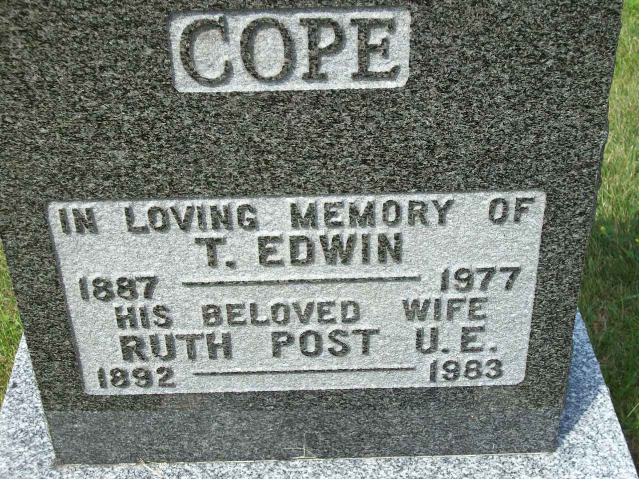 FindaGrave: Name: Ruth Post Cope; BIRTH: 2 Dec 1892; DEATH: 1983 (aged 90–91); BURIAL: Woods Cemetery. Cramahe Twp., Northumberland County, Ontario, Canada; PLOT: Row 7; MEMORIAL ID: 100967964 (https://www.findagrave.com/memorial/100967964/ruth-cope.)2,3