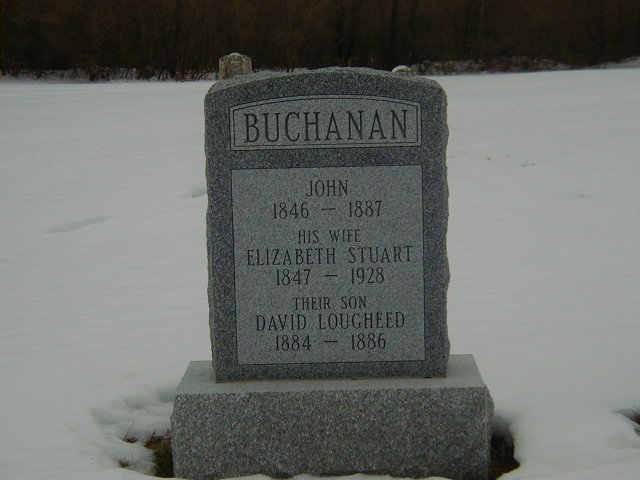 People noted are: (1) Elizabeth (Stuart) Buchanan (2) Ben and Jennie Stuart, Brighton, Ontario (3) Stella (Buchanan) Adams, R.R. # 5, Trenton, Ont. (4) Dave Stuart. She died on 10 October 1928 at Sidney Twp., Hastings Co., Ontario, at age 81; Death Reg'n. #017882-1928: Name: Elizabeth Buchanan; Died: Oct. 10, 1928; Age: 82y 4m 17d; Place of Death: Sidney Twp; Born: Ireland May 24 1846; Nat.: Irish; Status: widow; Occ.: housewife; Time at Place of Death: 10 yrs; In Ontario: 68 yrs; Father: Wm. Stuart, b. Ireland; Mother: Alice Hart, b. Ireland; Phys.: Dr. G. S. Cronk, Belleville; Informant: B. Buchanan, Warkworth, son; Buried: Carrying Place, Oct. 13, 1928; Undertaker: Tickell & sons, Belleville; Cause: diabetes, old age; Date of Return: Nov 6, 1928; Cert.: W. H. Nobes, R. R. #2, Belleville.9,17 She was buried on 13 October 1928 at Carrying Place Cemetery, Murray Twp., Carrying Place, Northubmerland Co., Ontario; Memorial: (See Exhibit) BUCHANAN; John; 1846 - 1887; His wife; Elizabeth Stuart; 1847 - 1928; Their Son; David Lougheed; 1884 - 1886 (Carrying Place Cemetery, Carrying Place, Dec. 27, 2005, new stone erected by Rev. Charles Buchanan)