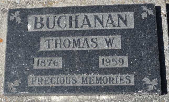 Note: Bill Buchanan said that he married Ethel Gamond twice.??1 Thomas Wragg Buchanan "He sold the farm and we moved to Winnipeg April 1st, 1920 and he worked for the C.P.R. until he was 67 years old." from letter written by Iolah Sep 23, 1972 to Jean Anderson. In the possession of Dan Buchanan, aug 2000. in 1943 at Winnipeg, Manitoba.15 He died on 7 March 1959 at Kelowna, British Columbia, at age 82; Name: Thomas Wragg Buchanan; Event Date: 1959 3 6; Age: 82; Gender: male; Event Place: Kelowna; Reg. Number: 1959-09-003513; B. C. Archives Microfilm Number: B13241; GSU Microfilm Number: 2033298 (Death Index Item from B. C. Vital Statistics On-line Database) Date 1959 per Memorial. Date March 6 1959 per FindaGrave.15,5,6 He was buried on 9 March 1959 at Kelowna Memorial Park Cemetery, Kelowna, Okanagan Dist., British Columbia; Memorial: (see Exhibit) BUCHANAN; Thomas W; 1876 - 1959 (Kelowna Memorial Park Cemetery, Kelowna, image from FindaGrave, Nov 19 2922)