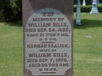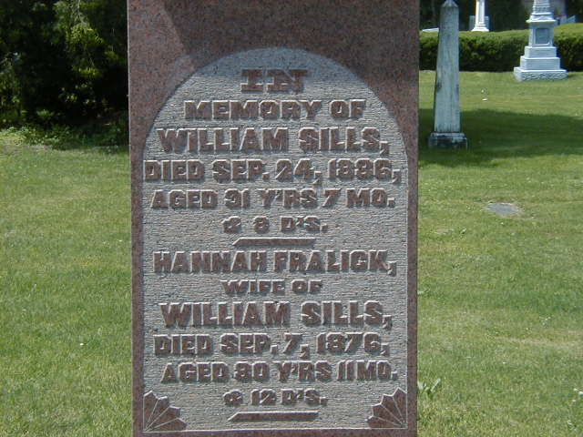William Bell Sills appeared on the census of 1851 at Thurlow Twp., Hastings Co., Canada West; Age 57 at 1851 Census: Sills, Wm., 57, b. Cda., EM, farmer, married; Hannah, 56, b. Cda., EM, married; David G., 23, b. Cda., EM, lab., single; George T., 21, b. Cda., EM, lab., single; Elizabeth, 19; Wm., 15; Pter D., 13 (1851 Census: Thurlow Twp., Hastings Co., pg. 120 of 194, line 14 - ancestry.ca.)3 He appeared on the census of April 1861 at Thurlow Twp., Hastings Co., Canada West; Age 67 at 1861 Census: Sills, Wm., 67, b. CW, EM, farmer, married; Hannah, 66, b. CW, EM, wife of Wm. Sills, married; Wm. Jr., 24, b. Cda., EM, lab., single; Peter D., 22, b. CW, EM, lab., single; Lloyd, Elizabeth, 20, b. CW, EM, servant, single; Sills, David, 30, b. CW, EM, farmer, married; Mary Ann, 28, b. CW, EM, wife of David Sills, married; Frances, 6; Henrietta, 4 (1861 Census: Thurlow Twp., Hastings Co., pg. 653 of 983, line 44 - ancestry.ca.)4 He died on 24 September 1886 at Thurlow Twp., Hastings Co., Ontario, at age 91; Date Sep 24 1886 per Memorial. per GEDCOM of Donna Barraclough-Little, May 6, 2003.1,2 He was buried on 26 September 1886 at Belleville Cemetery, Belleville, Hastings Co., Ontario; Memorial: (See Exhibit) In; Memory of; William Sills; Died Sep.t 24, 1886; Aged 91 Y'rs 7 Mos; & 8 D's; Hannah Fralick; Wife of; William Sills; Died Sept. 7 1876; Aged 80 Y'rs 11 Mo; & 12 D'ys (Belleville Cemetery, Belleville, June 22, 2006.)2