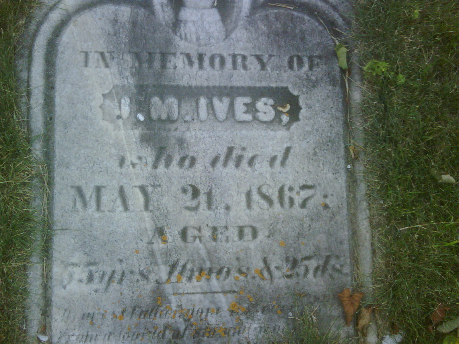 Julius Mortimer Ives was born on 27 May 1811 at Hamden, Connecticut, U.S.A; Date per Memorial - age 55y 11m 25d at death May 21 1867. Date Jan 24 1811 & location Hamden, Conn. per family tree of ives99 on ancestry.ca, March 2 2017. Location per Troy Brown's GEDCOM. Date.2 He married Almira Brown, daughter of Ira Brown and Elenor Maude Purdy, on 29 August 1836 at Cramahe Twp., Northumberland Co., Upper Canada; Newcastle Marriage Register: Julius M. Ives to Almyra Brown, both of Cramahe, 29 Aug 1836, at Cramahe, Rev. Huntington; Witnesses: Mary Hoyt & Richard Purdy.3 Julius Mortimer Ives appeared on the census of 1839 at Cramahe Twp., Northumberland Co., Canada West; 1839 Census: Mortimer Ives; 2 males under 16, 1 male over 16, 1 female over 16. He appeared on the census of 1850 at Conc 1 Lot 25, Cramahe Twp., Northumberland Co., Canada West; 1850 Census: J. M. Ives; Conc 1, Lot 25, occ., non-prop; Total 8 Persons. He appeared on the census of 1853 at Cramahe Twp., Northumberland Co., Canada West; Age 41 at 1851 Census: Ives, Julius M., 41, b. US, WM, farmer,married; Almira, 34, b. Cda., WM, married; Ira, 14; Elam B., 10; George, 11; Susannah, 8; William, 5; Hurlburt, 3, Benj., 1 (1851 Census: Cramahe Twp., Northumberland Co., pg. 79 of 131, line 38 - ancestry.ca.)4 He lived in 1853 at Conc 1 Lot 25, Cramahe Twp., Northumberland Co., Canada West; Per 1851 Census. He appeared on the census of April 1861 at Colborne, Northumberland Co., Canada West; Age 50 at 1861 Census": Ives, J. M., 50, b. US, WM, farmer, married; Almira, 43, b. UC, married; Elam, 23?; George, 17; William, 11; Hiram, 9; Hulbert, 8; Edward, 5; Lucinda, 13; Harriett, 7; Emma, 2; Ira, 23 (1861 Census: Cramahe Twp., Northumberland Co., pg. 531 of 899, line 44 - ancestry.ca.)5 He died on 21 May 1867 at Cramahe Twp., Colborne, Northumberland Co., Ontario, at age 55; Date May 21 1867 per Memorial.6 He was buried on 23 May 1867 at Salem Cemetery, Cramahe Twp., Salem, Northumberland Co., Ontario; Memorial: (See Exhibit) In Memory of; J. M. Ived; who died; May 21, 1867; Aged; 55 Y'rs, 11 mo's & 25 d's (Salem Cemetery, Cramahe Twp., July 6, 2009) CEMSearch: Name: I. M. Ives; Born: - ; Died: 1867-05-21; Age: 55y 11m 25d; Buried: Salem Cemetery; No other names.6