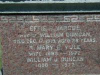 William J. Duncan was born on 17 July 1888 at Seymour Twp., Northumberland Co., Ontario; Date 1888 per Memorial. Date 1888 & location Seymour Twp. per marr. reg'n. - Effie B. Varcoe. per email from Dorothy (Buchanan) Grant, Apr 24, 2003.1,3,2 He married Effie B. Varcoe, daughter of Thomas Varcoe and Ida Kingsbury, on 17 April 1912 at Campbellford, Northumberland Co., Ontario; Marriage Reg'n.#014830: Groom: William J. Duncan; Age: 23; Res.: Percy Twp; Born: Seymour Twp; Status: bachelor; Rel.: Meth; Parents: George Duncan & Emma Holland; Bride: Effie B. Varcoe; Age: 21; Res.: Seymour Twp; Born: Percy Twp; Status: spinster; Rel.: Meth; Parents: Thomas Varcoe & Ida Kingsbury; Wit.: Clifford Cassan, Campbellford & Violet Varcoe, Campbellford; Date: Apr 17 1912; Place: Campbellford; Performed by: ?A. J. St. Strike?, Campbellford; Sworn: Campbellford, Apr 15 1912; Reg'r.: S. J. Fisher, Campbellford (Ontario Marriage Registration, #014830-1912, ancestry.ca.)1,4 William J. Duncan lived on 18 December 1919 at Percy Twp., Northumberland Co., Ontario; Informant for Death Reg'n. of his first wife Effie b. Varcoe.5 He married Mary E. Yule after 1920; First wife died in 1919.1,5 William J. Duncan was buried in 1977 at Mount Pleasant Cemetery, Campbellford, Northumberland Co., Ontario; Memorial: (See Exhibit) Effie B. varcoe; wife of William Duncan; Died Dec. 17, 1919, Aged 28 Years; R. Mary E. Yule; Wife 1893 - 1972; William J. Duncan; 1888 - 1977 (Mount Pleasant Cemetery, Campbellford, Aug 11 2006) per email from Dorothy (Buchanan) Grant, Apr 24, 2003.1,3 He died in 1977 at Ontario; Date 1977 per Memorial. per email from Dorothy (Buchanan) Grant, Apr 24, 2003.1,3