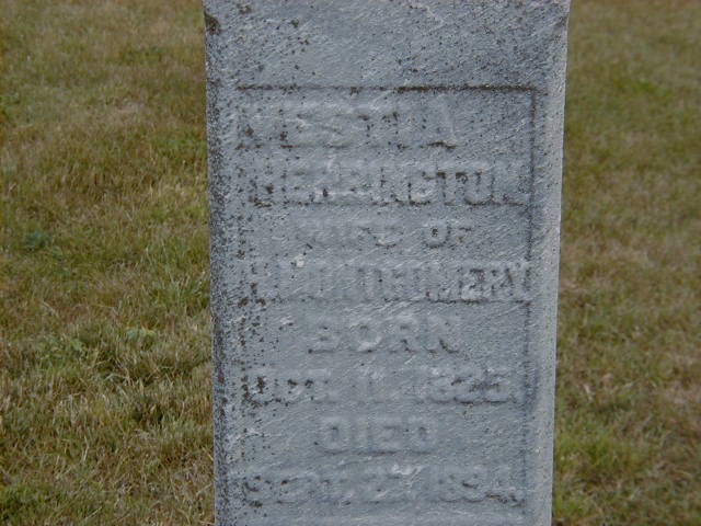 "She married the brother of her sister Lucinda's husband." per GEDCOM of Barbara Lenker, Mar 15, 2004.1,5 Vestia Herrington appeared on the census of 1851 at Brighton Twp., Northumberland Co., Canada West; Age 27 at 1851 Census: see Henry Montgomery.6 She appeared on the census of April 1861 at Brighton Twp., Northumberland Co., Canada West; Age 35 at 1861 Census: see Henry Montgomery.7 She appeared on the census of April 1871 at Brighton Twp., Northumberland Co., Ontario; Age 48 at 1871 Census: see Henry Montgomery.3 She appeared on the census of April 1881 at Brighton Twp., Northumberland Co., Ontario; Age 55 at 1881 Census: see Henry Montgomery.8 She appeared on the census of April 1891 at Brighton Twp., Northumberland Co., Ontario; Age 65 at 1891 Census: see Henry Montgomery.2 She died on 27 September 1894 at Brighton Twp., Northumberland Co., Ontario, at age 68; Death Reg'n.#011883: Name: Mrs. Vesta Montgomery; Date: Sep 27 1894; Age: 69y; Status: wife of Henry Montgomery; Born: Prince Edward Co; Cause: dropsy, heart disease, 2 yrs; Inf. & Phys.: Dr. C. M. Sanford, Brighton; Reg'd.: Oct 14 1894; Rel.: Meth; Reg'r.: A. A. Becker (Ontario Death Registration, #011883-1894, ancestry.com) Date Sep 27 1894 per GEDCOM of Barbara Lenker, Mar 15, 2004.1,9 She was buried on 29 September 1894 at Carman Cemetery, Brighton Twp., Northumberland Co., Ontario; Memorial: (See Exhibit) Vestia; Herrington; Wife of; H. Montgomery; Born; Oct 11 1825; Died; Sep 27 1894 (Carman Cemetery, Brighton Twp.)10