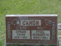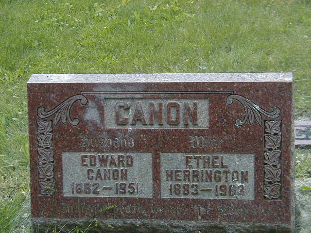 Ethel Herrington was born on 9 March 1883 at Ameliasburgh Twp., Prince Edward Co., Ontario; Date Mar 9 1883 & location Ont. rural per 1901 Census. Date 1884 per 1891 Census. Date Mar 9 1883 per GEDCOM of Barbar Lenker, Mar 15, 2004.1,2,3 She appeared on the census of April 1891 at Ameliasburgh Twp., Prince Edward Co., Ontario; Age 7 at 1891 Census: see George Herrington.2 She appeared on the census of April 1901 at Ameliasburgh Twp., Prince Edward Co., Ontario; Age 19 at 1901 Census: see George Albert Herrington.3 As of 26 October 1904,her married name was Canon.4 She married Edward Canon, son of Charles Canon and Sarah Young, on 26 October 1904 at Prince Edward Co., Ontario; Marriage Reg'n.#015156: Groom: Edward Cannon; Age: 22; Res. & Born: Bloomfield; Status: bachelor; Occ.: lab; Parents: Chas. Cannon & Sarah Young; Bride: Ethel Herrington; Age: 21; Res. & Born: Ameliasburg; Status: spinster; Parents: Geo. A. Harrington & Mary Wannamaker; Wit.: Harry Herrington, Ameliasburg & Dora N. Couch, Smithfield; Date: Oct 26 1904; Place: Ameliasburg; Rel.: Meth. & Anglican; Performed by: Rev. B. F. Byers; Reg'd.: Oct 27 1904 (Ontario Marriage Registration, ancestry.com, #015156-1904.)5