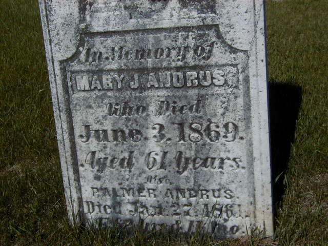 CEMSearch: Name: Mary J. Andrus; Born: - ; Died: 1869-06-03; Age: 61y; Notes: On stone with Palmer Andrus; Buried: Eddystone Cemetery, Conc 4, Lot 17, Haldimand; Other names: Palmer Andrus ( -1861.)3,4