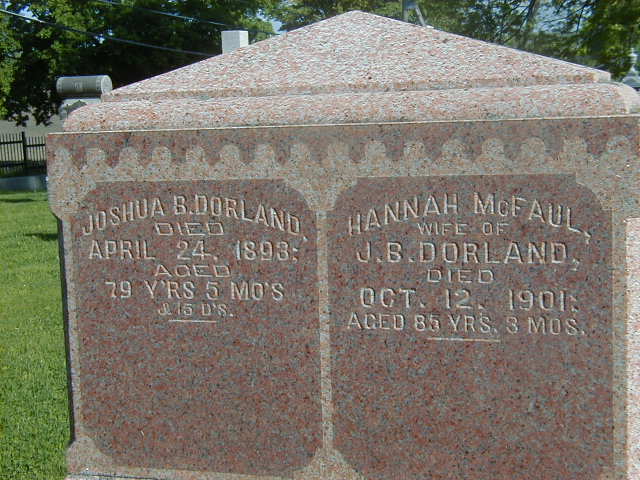 Date 1894 per GEDCOM of George Gildersleeve, June 17, 2004.1,8,4 He was buried on 26 April 1893 at Wellington Cemetery, Wellington, Prince Edward Co., Ontario; Memorial: (See Exhibit) Joshua B. Dorland; Died; April 24, 1893; Aged; 79 Y'rs 5 Mo's; & 15 D's; Hannah McFaul; Wife of J. B. Dorland; Oct 12, 1901; Aged 85 Yr's 3 Mos. (Wellington Cemetery, Wellington, May 28 2006.)4