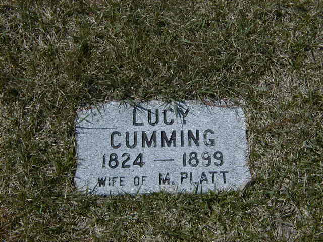 Note: Placing this Lucy Cumming with James Cumming and Mary Young on strength of "Cumming" on her memorial and date and location. Is this right???1,3,4,2,5,6,7,8 As of 12 April 1842,her married name was Platt.1 She married Maitland Platt, son of James Platt and Mary Ann ?, on 12 April 1842 at Percy Twp., Northumberland Co., Canada West; per GEDCOM of Doug Norman, June 12, 2004.1 Lucy Cumming appeared on the census of 1852 at Percy Twp., Northumberland Co., Canada West; Age 27 at 1851 Census: see Maitland Platt.7 She appeared on the census of April 1861 at Percy Twp., Northumberland Co., Canada West; Age 37 at 1861 Census: see Maitland Platt.8 She appeared on the census of April 1871 at Percy Twp., Northumberland Co., Ontario; Age 47 at 1871 Census: see Maitland Platt.6 She appeared on the census of April 1881 at Percy Twp., Northumberland Co., Ontario; Age 56 at 1881 Census: see Maitland Platt.4 She died on 24 January 1899 at Percy Twp., Northumberland Co., Ontario; Death Reg'n.#018925: Name: Lucy Platt; Date: Jan 24 1899; Age: 75; Res.: Conc 1, Lot 18, Percy Twp; Status: widow; Cause: epilepsy, 1 hour; Phys.: N. D. Richards; Rel.: Pres; Inf.: Chas. B. Platt; Reg'd.: Feb 3 1899; Reg'r.: R. P. Hurlburt (Ontario Death Registration, #018925-1899, ancestry.com)