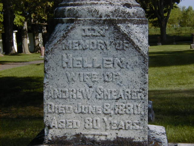 Helen ? was born in 1800; Date 1800 per Burial. from GEDCOM of John Maybee, June 20, 2004. per marriage reg'n. of daughter Elizabeth (Shearer) Clysdale.1,2,3 She married Andrew Shearer before 1825; from GEDCOM of John Maybee, June 20, 2004.1 As of before 1825,her married name was Shearer.1 Helen ? died on 8 June 1880 at Ontario; Date Jun 8 1880 per Burial.2 She was buried on 10 June 1880 at Trent Valley Cemetery, Hastings, Northumberland Co., Ontario; Memorial: (See Exhibit) In; Memory of; Hellen; Wife of; Andrew Shearer; Died June 8 1880; Aged 80 Years (Trent Valley Cemetery, Hastings, June 3, 2005.)2