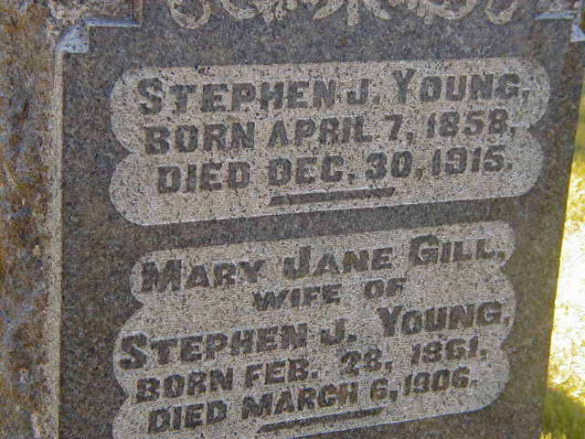 Date Dec 30 1915 per Memorial.6,9 He was buried on 2 January 1916 at St. George's Cemetery, Trenton, Northumberland Co., Ontario; Memorial: (See Exhibit) Stephen J. Young; Born April 7, 1858; Died Dec 30, 1915; Mary Jane Gill; Wife of; Stephen J. Young; Born Feb 28, 1861; Died Mar 6, 1906 (St. George's Cemetery, Trenton, sep 24, 2005.)6