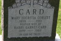 Mary Lucretia Corlett was born on 30 May 1898 at Brighton Twp., Northumberland Co., Ontario; Birth Reg'n.#...: Name:" Mary Lucretia Corlett; Date: May 30 1898; Parents: John J. Corlett & Minnie Grosjean... pg. 2 not available .. (Ontario Birth Registration, #... , ancestry.ca) Date 1898 per Memorial. Date May 1898 & location Ont. per 1911 Census. Date May 30 1898 & location Ont. rural per 1901 Census. Date 1898 & location Ont. per marr. reg'n. from page 24 of "Ours To Remember" by Mary Ann Down, given to me by Shirley (Goodfellow) Bird, Sep. 3, 2004.1,2,3,4,5,6 She appeared on the census of 11 April 1901 at Brighton Twp., East Northumberland Co., Ontario; Age 1 at 1901 Census: see John J. Corlett.4 She appeared on the census of 1911 at Brighton, East Northumberland Co., Ontario; Age 13 at 1911 Census: see John J. Corlett.5 She lived on 28 October 1924 at Brighton, Northumberland Co., Ontario; Witness at marriage of John Morris Corlett & Beatrice Norene Johnson.2 As of 22 November 1924,her married name was Card.1 She lived on 22 November 1924 at Brighton, Northumberland Co., Ontario; Residence Brighton per marr. reg'n.2 She married Harry Garnet Card, son of John Elwood Card and Amarilla H. E. "Rillie" Mutton, on 22 November 1924 at Brighton, Northumberland Co., Ontario; Marriage Reg'n.#015334: Groom: Harry Garnet Card; Age: 25; Res.: 12 Geoffrey St; Born: Ont; Status: bachelor; Occ.: Mechanic; Rel.: Meth; Parents: John E. Card, b. Ont., & Amarilla Mutton; Bride: Mary Lucretia Corlett; Age: 26; Res.: Brighton; Born: Ont; Status: spinster; Occ.: none; Resl.: Pres; Parents: John J. Corlett, b. Isle of Man & Mary L. Grosjean; Expected Res.: Brighton; Wit.: Hugh Douglas McCall, Brighton & Ada L. Corlett, Brighton; Date: Nov 22 1924; Place: Brighton; Performed by: a. K. Mcleod, Brighton, Pres; Sworn: Toronto, Nov 15 1924; Reg'r.: Fred Williamson, Deputy Reg'r., Toronto (Ontario Marriage Registration, #015334-1924, ancestry.ca)