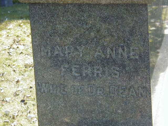 CemSear5ch: Name: Mary Ann Dean; Maiden: Ferris; Born: - ; Died: - ; ID: MTHOPE424; Note: Mary is not buried here; Other names: Ferris, Addied (1867-1868), Ferris, Elizabeth [Proctor](1839-1882), Ferris, Jennie M. (1793-1877), Margaret, (1821-1913), Matthew (1832-1893), Johns, Mary Jane ( -1879); Cemetery: Mount Hope Cemetery, Conc A, Lot 35, Brighton Twp., Brighton Village, Sec 1 Ropw 22; Note: (Mausoleum) Wife of Dr. Dean. (No dates) (https://www.cemsearch.ca/burial/?pid=MTHOPE424%5E1.)8,9