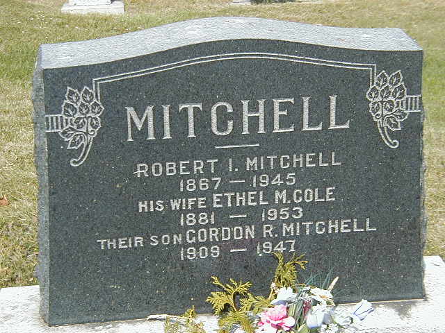 "Ethel married Robert I. Mitchell of Norham." from page 70 & 71 of "Ours To Remember" by Mary Ann Down, given to me by Shirley (Goodfellow) Bird Sep. 3, 2004.1,8 Robert Isaiah Mitchell appeared on the census of 1911 at Percy Twp., Norham, Northumberland Co., Ontario; Age 44 at 1911 Census: Mitchell, R. J., 44, b. Ont. Mar 29 1867; Irish, Meth., General Store, married; Ethel, 29, b. Ont. Oct 15 1882, Dutch, Meth., married; Lula, 4, b. Mar 12 1907, daughter; Gordon, 2, b. Apr 12 1909, son; Cole, Florence, 21, b. Oct 27, 1880, Dutch, Meth., Teacher, boarder, single; McNutt, May, 16, b. June 11 1895, Dutch, Meth., ??family?? (1911 Census Online: Percy, dist. 101, sub-dist. 26, pg. 11, line 49 - Conc 2, pt. Lot 17.)5 He lived on 9 September 1914 at Percy Twp., Norham, Northumberland Co., Ontario; Witness at marriage of Lorne Evans & Florence Cole.4 He lived on 5 October 1934 at Warkworth, Northumberland Co., Ontario; Informant for Late Birth Reg'n. of his brother George Alfred Mitchell.9 He died on 5 January 1945 at Northumberland Co., Ontario, at age 77; Date Jan 5 1945 per CEMSearch Record. from page 70 of "Ours To Remember" by Mary Ann Down, given to me by Shirley (Goodfellow) Bird Sep. 3, 2004.1,10 He was buried on 7 January 1945 at Stone Cemetery, Percy Twp., Northumberland Co., Ontario; Memorial: (See Exhibit) MITCHELL; Robert I. Mitchell; 1867 - 1945; His Wife Ethel M. Cole; 1881 - 1953; Their Son Gordon R. Mitchell; 1909 - 1947 (Stone's Cemetery, Percy Twp.)