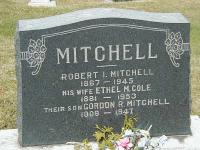CEMSearch: Name: Robert I. Mitchell; Born: 1867; Died: 1945-01-05; Notes: Born Cramahe, 4th son of Samuel and Esther, husband of Ethel Cole, fathe of Gordon R., grandson Howard; Buried: Stone's Cemetery, Percy Twp., Sec 3 Plot 07; Other names: Ethel M. Mitchell (Cole) (1881-1953), Gordon R. Mitchell (1909-1947)