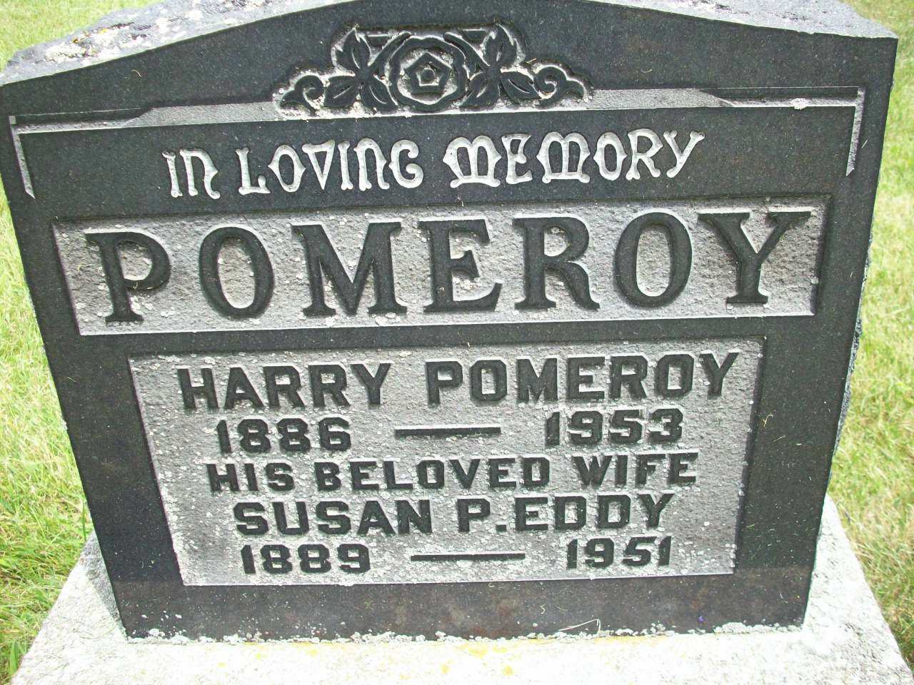 Harry Pomeroy was born on 26 November 1886 at Cramahe Twp., Castleton, Northumberland Co., Ontario; Date 1886 per Memorial. Date 1886 & location Ont. per 1921 Census. Date Nov 26 1886 & location Castleton per GEDCOM of Alton Rogers, Mar 2, 2005. from page 143 of "Ours To Remember" by Mary Ann Down, given to me by Shirley (Goodfellow) Bird, Sep. 3, 2004.1,2,3,4,5 He appeared on the census of April 1901 at Cramahe Twp., Northumberland Co., Ontario; Age 14 at 1901 Census: see Henry Pomeroy.6 He married Susan Pearl "Susie" Eddy, daughter of Roberet Laverne Eddy and Mary Ann Pogue, before 1910 at Northumberland Co., Ontario; "Susan married Harry Pomeroy. They have one son, Bernard. They live at Castleton. (Susie died in 1951). " from page 143 of "Ours To Remember" by Mary Ann Down, given to me by Shirley (Goodfellow) Bird, Sep. 3, 2004.1 Harry Pomeroy lived on 12 March 1910 at Cramahe Twp., Castleton, Northumberland Co., Ontario; Informant for Death Reg'n. of his father Henry Pomeroy.7 He appeared on the census of 9 June 1921 at Cramahe Twp., Castleton, Northumberland Co., Ontario; Age 35 at 1921 Census: Pomeroy, Harry, 35, b. Ont., p.b. Ont., Eng., Meth., Baker, married; Mary Pearl, 34, b. Ont., Eng., Meth., married; Bernard Laragn, 6, son (1921 Cesus: Cramahe Twp., Northumberland Co., dist. 107, sub-dist. 11, pg. 11, line 4 - Castleton Village - ancestry.ca.)5 He died on 25 November 1953 at Ontario at age 66; Date1953 per Memorial. Date Nov 25 1953 per GEDCOM of Alton Rogers, Mar 2, 2005.3,4 He was buried on 27 November 1953 at Castleton Cemetery, Castleton, Northumberland Co., Ontario; Memorial: (See Exhibit) In Loving Memory; POMEROY; Harry Pomeroy; 1886 - 1953; His Beloved Wife; Susan P. Eddy; 1889 - 1951 (Castleton Cemetery, Castleton, July 15 2009) per GEDCOM of Alton Rogers, Mar 2, 2005.3,4