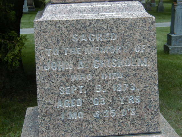 CEMSearch: Name: J. A. Chisholm; Sex: M; Born: - ; Died: - ; Buried: Longwell Cemetery, Conc 5, Lot 35, Sidney Twp., Row 00J Plot 0002; Other names: Francis H. Chisholm (Chisholm)( -1853.)12,6