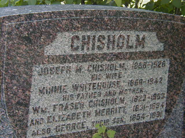 Date 1908 per Memorial. Date 1908 per email from Andrew Way, Jan 9, 2006. Date 1908 per "Descendants of Alexander Chisholm" sent to me via email by Sandra Pope, Oct 5, 2005.3,14,7 He was buried on 2 February 1908 at Roslin United Church Cemetery, Huntingdon Twp., Roslin, Hastings Co., Ontario; Memorial: (See Exhibit) CHISHOLM: Joseph M. Chisholm 1858 - 1926; His Wife; Minnie Whitehouse 1866 - 1942; His Father and Mother; Wm. Fraser Chisholm 1829 - 1908; and Elizabeth Merritt 1831 - 1894; also George their son 1854 - 1891 (Roslin United Church Cemetery, Roslin, June 24, 2006.)7