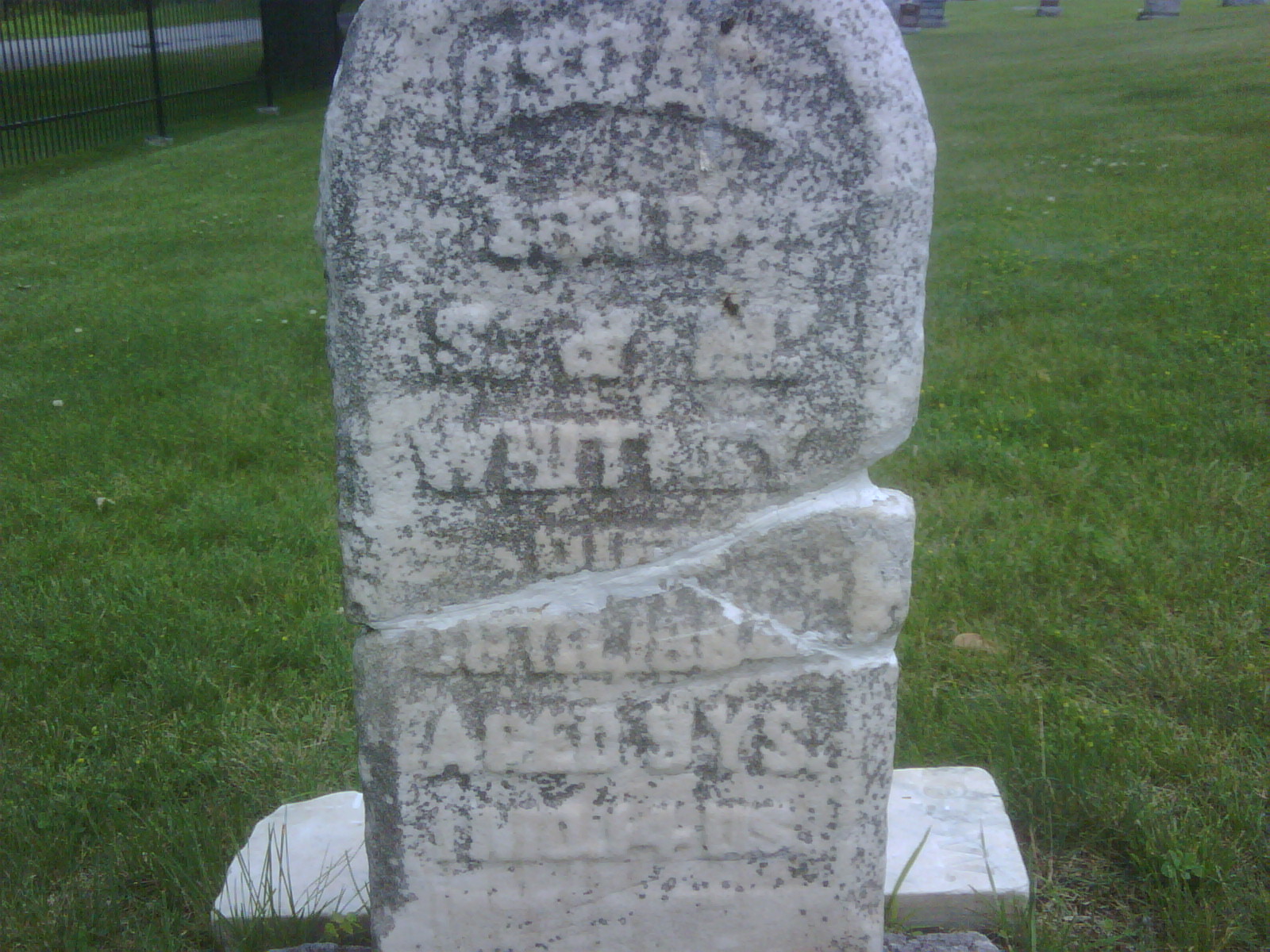 Mary Ann Newcomb was born on 15 March 1858 at Brighton Twp., Northumberland Co., Canada West; Date Mar 15 1858 per Memorial - age 5y 10m? 19d at death Feb 3? 1864. Date 1858 per 1861 Census.1,2 She appeared on the census of April 1861 at Brighton Twp., Northumberland Co., Canada West; Age 3 at 1861 Census: see Stephen Newcomb.1 She died on 3 February 1864 at Brighton Twp., Northumberland Co., Canada West, at age 5; Date Feb 3 1864 per Memorial.2 She was buried on 5 February 1864 at Salem Cemetery, Cramahe Twp., Salem, Northumberland Co., Canada West; Memorial: (See Exhibit) In Memory of; Mary Ann; Who Died; Feb 3? 1864; Aged 5 Y'rs; 10? Mo's & 19 D's; Rosa Laura?; Who Died; Sept 8, 1866?; Aged 3 Y'rs..? ; Children of; (unclear) Newcomb (Salem Cemetery, Cramahe Twp., July 4, 2009.)2