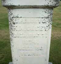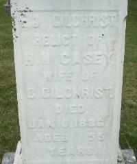 Eliza Jane Gilchrist was born on 29 June 1831 at Cramahe Twp., Colborne, Northumberland Co., Upper Canada; Date 1827 & location Cda. per Death Reg'n. - age 59 at death Jan 10 1886. Date 1830 & location Ont. per 1871 Census. Date 1829 & location Cda.per 1851 Census. per GEDCOM of Roxanne Muns, Jan 25, 2005.1,2,3,4 As of 1 November 1847,her married name was Casey.1 She married Horatio Nelson Casey, son of Samuel Casey and Cynthia Sharp, on 1 November 1847 at Boonvillle, Oneida Co., New York, U.S.A; per GEDCOM of Roxanne Muns, Jan 25, 2005.1 Eliza Jane Gilchrist appeared on the census of 1852 at Cramahe Twp., Northumberland Co., Canada West; Age 22 at 1851 Census: see Horatio Nelson Casey.3 She appeared on the census of April 1871 at Colborne, Northumberland East Co., Ontario; Age 41 at 1871 Census: see Horation Nelson Casey.2 She died on 10 January 1886 at Hope Twp., Port Hope, Northumberland Co., Ontario, at age 54; Death Reg'n.#012201: Name: Eliza Jane Gilchrist; Date: Jan 10 1886; Age: 59; Status: married; Born: Cda; Cause: cancer, 6y; Phys. & Inf.: Dr. Powers; Reg'd.: Jan 11 1886; Rel.: CE; Reg'r.: ? Sanders?, Port Hope (Ontario Death Registration, #012201-1886, ancestry.ca) Date Jan 10 1886 per Memorial. Date Jan 10 1886 & location Port Hope per GEDCOM of Roxanne Muns, Jan 25, 2005.1,5,6 She was buried on 12 January 1886 at Lakeport Cemetery, Haldimand Twp., Lakeport, Northumberland Co., Ontario; Memorial: (see Exhibit) E. J. Gilchrist; Relict of; H. N. Casey; Wife of; C. Gilchrist; Died; Jan. 10. 1886; Aged 55; Years (Lakeport Cemetery, Haldimand Twp., May 29 2021, by Dan) per GEDCOM of Roxanne Muns, Jan 25, 2005.1,5