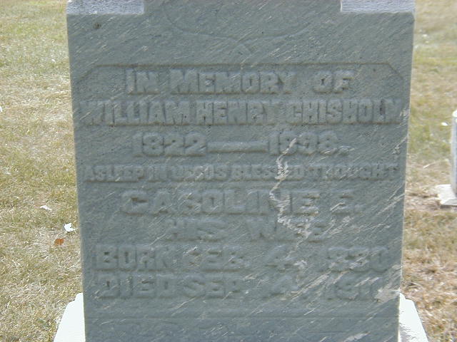 Caroline E. Hough was born on 4 February 1830 at Ontario; Date Feb 4 1830 per Memorial. Date 1831 & location Ontario per 1881 Census. Date 1832 & location Ont. per 1871 Census.1,4,5 As of before 1851,her married name was Chisholm.1 She married William Henry Chisholm, son of Lt. Col. Archibald Chisholm and Margaret Frederick, before 1851 at Hastings Co., Ontario; per 1871 Census. per 1881 Census.1,4 Caroline E. Hough appeared on the census of April 1861 at Madoc Twp., Hastings Co., Ontario; Age 30 at 1861 Census: see Henry Chisholm.6 She appeared on the census of April 1871 at Stirling, Hastings Co., Ontario; Age 39 at 1871 Census: see Henry Chisholm.4 She appeared on the census of April 1881 at Stirling, Hastings Co., Ontario; Age 50 at 1881 Census: see Henry Chisholm.1 She died on 14 September 1911 at Stirling, Hastings Co., Ontario, at age 81; Date Sep 14 1911 per Burial.3 She was buried on 16 September 1911 at Stirling Village Cemetery, Rawdon Twp., Stirling, Hastings Co., Ontario; Memorial: (See Exhibit) In Memory of; William Henry Chisholm; 1822 - 1898; Caroline E; His Wife; Born Feb 4 1830; Died Sept. 14, 1911 (Stirling Cemetery, Aug 27, 2005)