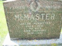 Note: This is north of the old canal reserve on Dead Creek, with the English Settlement road running through it.8 He appeared on the census of April 1861 at Murray Twp., Northumberland Co., Canada West; Age 37 at 1861 Census: McMasters, Jacob, 37, b. UC, WM, farmer, married; Ann, 32, b. Ireland, WM, married; Abel Wellington, 10, b. UC; Elizabeth Jane, 8; Sarah Margaret, 6; Lyman Worden, 3; Jacob Henry, 1 (1861 Census: Murray Twp., pg. 883 of 899, line 27 - ancestry.com.)2 He appeared on the census of April 1871 at Murray Twp., Northumberland East Co., Ontario; Age 47 at 1871 Census: McMasters, Jacob, 47, b. Ont., Irish, WM, farmer, married; Ann, 42, b. Ont., Irish, WM, married; Able, 18, b. Ont., Irish, WM, farmer, single; Elizabeth J., 17; Sarah M., 15; Lyman W., 12; Jacob H., 10; Mary F., 7; Hannah A., 5 (1871 Census: Murray Twp., Northumberland East Co., dist. 55, sub-dist. e-1, pg. 4, line 18 - ancestry.ca.)3 He died on 20 May 1910 at Northumberland Co., Ontario; Date 1910 per Memorial & CemSearch. Date May 20 1910 & location Northumberland Co. per family tree of Ronald Welsch on ancestry.ca, Nov 22 2020.7,5,4 He was buried on 22 May 1910 at Greenwood Cemetery, Murray Twp., Smithfield, Northumberland Co., Ontario; Memorial: (See Exhibit) McMaster; Father - Mother; Jacob McMaster; 1824-1910; His Wife; Ann Hopkins; 1829-1893 (Greenwood Cemetery, Smithfield, June 30 2013, by Dan)