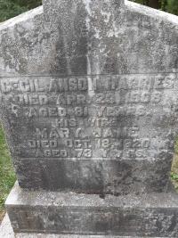 Mary Jane Allard was born on 14 July 1847 at Murray Twp., Weller's Bay, Northumberland Co., Canada West; Date 1847 per Memorial - age 73 at death Oct 18 1920. Date June 1847 & location Weller's Bay per Death Reg'n. Date Jul 14 1847 & location Ont. rural per 1901 Census. Date 1849 & location Ont. per 1891 Census. Date 1846 & location UC per 1861 Census. Date 1845 & location Cda. per 1851 Census. Date Jul 14 1847 & location Weller's Bay, Murray Twp.,Northumberland Co. per family tree of MarchHare2 on ancestry.ca, Feb 5 2022.1,2,3,4,5,6,7 She appeared on the census of 1852 at Murray Twp., Northumberland Co., Canada West; Age 6 at 1851 Census: see Hannah Allard (grandmother.)7 She appeared on the census of April 1861 at Murray Twp., Northumberland Co., Canada West; Age 15 at 1861 Census: see Henry Allard.1 As of circa 1868,her married name was Harries.2 She married Cecil Anson Harries circa 1868 at Ontario; per family tree of MarchHare2 on ancestry.ca, Feb 5 2022.2 Mary Jane Allard appeared on the census of 11 April 1891 at Murray Twp., Northumberland East Co., Ontario; Age 42 at 1891 Census: see Cecil A. Harries.4 She appeared on the census of 12 April 1901 at Murray Twp., Northumberland East Co., Ontario; Age 53 at 1901 Census: see Cecil A. Harries.3 She died on 18 October 1920 at Murray Twp., Carrying Place, Northumberland Co., Ontario, at age 73; Death Reg'n.#027367: Name: Mary Jane Harries; Date: Oct 18 1920; Age: 73y; Res.: Carrying Place, Murray Twp., 20y; Born: Weller's Bay, Murray Twp., June 1847; Nat.: Eng; Status: widow; Parents: Henry Sanford Allard, b. Ont. & Catherine Lawson, b. Pr. Edward Co; Inf.: G. H. Harries, Indianapolis, Indiana, USA, son; Burial: Mount Carmel Cemetery, Oct 20 1920; Und.: N.J. McNair, Trenton; Cause: pernicious anaemia; Phys.: R.J. Wade, Brighton; Reg;d.: Oct 19 1920; Reg'r.: E.M. Wessels, Murray Twp. (Ontario Death Registration, #027367-1920, ancestry.ca) per family tree of MarchHare2 on ancestry.ca, Feb 5 2022.8 She was buried on 20 October 1920 at Mount Carmel Cemetery, Murray Twp., Northumberland Co., Ontario; Memorial: (see Exhibit) Cecil Anson Harries; Died Apr. 23, 1908; Aged 81 Years; His Wife; Mary Jane; Died Oct. 18, 1920; Aged 73 Years (Mount Carmel Cemetery, Murray Twp., image from FindaGrave, Feb 5 2022) Date Oct 20 1920 & location Mount Carmel Cemetery per Death Reg'n.5,6
