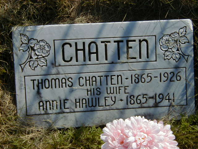 CEMSearch: Name: Annie Chatten; Maiden: Hawley; Born: 1865; Died: 1941; Notes: Wife of Thomas Chatten; Buried: Salem Cemetery, Sec NW; Other names: Thomas Chatten (1865-1926)