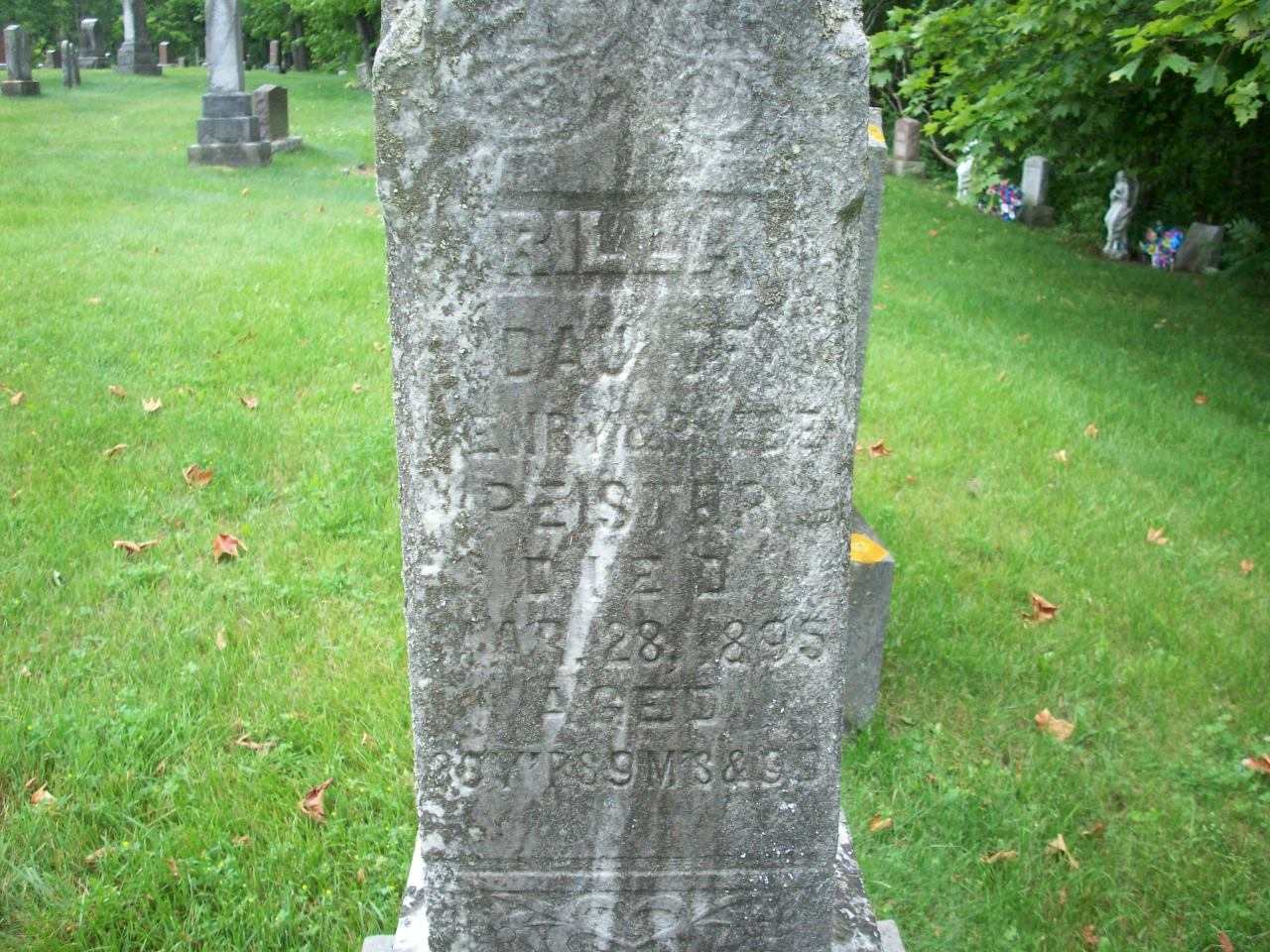 Aurilla Peister was born on 25 June 1866 at Brighton Twp., Northumberland Co., Canada West; Date Jun 25 1866 per Memorial - age 28y 9m 3d at death Mar 28 1895. Date 1865 & location Brighton Twp. per Death Reg'n. Date 1847 & location Ont. per 1891 Census. Date 1864 & location Ont. per 1881 Census. Date 1864 & location Ont. per 1871 Census.1,2,3,4,5 She appeared on the census of April 1871 at Brighton Twp., Northumberland Co., Ontario; Age 6 at 1871 Census: see Henry Peister.2 She appeared on the census of April 1881 at Brighton Twp., Northumberland Co., Ontario; Age 17 at 1881 Census: see Henry Peister.1 She lived on 30 December 1885 at Brighton Twp., Northumberland Co., Ontario; Witness at marriage of her sister Elizabeth Louise Peister.6 She appeared on the census of April 1891 at Brighton Twp., Northumberland Co., Ontario; Age 24 at 1891 Census: see Henry Peister.4 She died on 28 March 1895 at Brighton Twp., Northumberland Co., Ontario, at age 28; Death Reg'n.: #012373: Name: Aurilla Peister; Date: Mar 28 1895; Age: 30y; Occ.: seamstress; Born: Brighton Twp; Cause: Bright's Disease, 1 week; Phys.: R. J. Wade; Inf.: N. B. H. Dean; Reg'd.: Mar 28 1895; Reg'r.: J. H. Morrow (Ontario Death Registration, #012373-1895, ancestry.com.)7 She was buried on 30 March 1895 at Greenwood Cemetery, Smithfield, Northumberland Co., Ontario; Memorial: (See Exhibit) Aurilla; Dau. of; Henry & Pheobe; Peister; Died; Mar 28 1895; Aged; 28y 9 M's & 3 D (Greenwood Cemetery, Smithfield, July 1 2013.)5