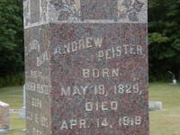 Andrew Peister was born on 18 May 1829 at Conc A, Brighton Twp., Northumberland Co., Upper Canada; Date May 18 1829 & location Conc A, Brighton Twp. per Death Reg'n. - age 88y 10m 27d at death Apr 14 1918. Date May 18, 1829 per Burial. Date May 1829 & location Ont. per 1911 Census. Date Aug 20 1827 & location Ont. rural per 1901 Census. Date 1830 & location Ont. per 1891 Census. Date 1829 & location Ont. per 1881 Census. Date 1830 & location Ont. per 1871 Census. Date 1829 & location UC per 1861 Census. Date 1828 & location Cda. per 1851 Census.1,2,3,4,5,6,7,8 He appeared on the census of March 1852 at Brighton Twp., Northumberland Co., Canada West; Age 23 at 1851 Census: see Peter Peister.1 He married Elizabeth Brown, daughter of William Brown and Ann ?, before 1853 at Northumberland Co., Canada West; per 1851 Census.7,1 Andrew Peister lived on 6 December 1854 at Conc 2 Lot 27, Brighton Twp., Northumberland Co., Canada West; Land Registry Records (B&S A880) show that Peter Peister & wife sold "50 acres in the south east quarter", lot 27, concession 2, Murray Twp., Northumberland Co. to John Linden. ITS Date: Dec 6 1854. Reg'n. Date: Dec 22 1858. (Ontario Land Registry Records, Northumberland Co., Brighton Twp., Conc 02, page 183 of 317)
