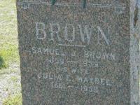 Samuel James Brown was born on 12 July 1859 at West Qwillimbury Twp., Bradford, Simcoe Co., Canada West; Date 1859 per Memorial. Date 1860 & location Ont. per 1921 Census. Date July 1862 & location Ont. per 1911 Census. Date Jul 12 1859 & location Ontario per 1901 Census. Date 1859 & location CW per 1861 Census. Date 1861 & location Cda. per marr. reg'n. Location Bradford, Ont. per marr. reg'n of his son Robert Henry Brown.1,2,7,3,8,5 He appeared on the census of April 1861 at Peel Twp., Wellington Co., Canada West; Age 2 at 1861 Census: see James Sheppard (grandfather.)7 He lived on 6 November 1887 at Essa Twp., Simcoe Co., Ontario; Residence Essa, Ont. per marriage reg'n.2 He married Julia Emmaline Maybee, daughter of Robert Brazila Maybee and Mary Ann Fairman, on 6 November 1887 at Trenton, Hastings Co., Ontario; Marriage Reg'n.#004711: Groom: S. J. Brown; Age: 26; Res.: Essa, Ont; Born: Cda; Status: bachelor; Occ.: farmer; Parents: George A. & J. Brown; Bride: Julia E. Maybee; Age: 24; Res; Frankford; Born: Cda; Status: spinster; Parents: R. & M. A. Maybee; Wit.: Annie Allen, Trenton; Date: Nov 6 1887?; Place: Trenton; Rel.: Meth; Performed by: H. J. Allen; Reg'r.: A. G. Whittier (Ontario Marriage Registration, #004711-1887, ancestry.ca) Date Mov 7 1887 per IGI Record. per 1901 Census.9,10 Samuel James Brown lived in 1891 at Ontario; Two children, Royden & Alice, shown to be born in N.D. and immigrated to Cda. 1891 - per 1901 Census.1 He appeared on the census of April 1901 at Brighton Twp., East Northumberland Co., Ontario; Age 41 at 1901 Census: Brown, Samuel J., b. Ont. Jul 12 1859, English, Meth., farm lab., married; Julia E., 39, b. Ont. May 3 1861, Dutch, Ce, married; Royden S., 11, b. N.D. Jul 21 1889, Immig. 1891, son, Meth; Alice, 10, b. N.D. Mar 6 1890, daughter; George A., 8, b. Ont. Jul 15 1894, son; Robert, 4, b. Ont. Sep 19 1896, son (1901 Census: Brighotn Twp., East Northumberland Co., dist. 95, sub-dist. a-1, pg. 3, line 26 - ancestry.ca.)1 He lived in April 1901 at Conc 3 Lot 5, Brighton Twp., Northumberland Co., Ontario; Residence per 1901 Census: Conc 3, Lot 5.1 He lived in 1911 at Conc 7 Lot 13, Cramahe Twp., Nortbumberland Co., Ontario; Location of Samuel J. Brown in 1911, Conc 7, Lot 13, Cramahe Twp. which is just west of the Goodrich-Loomis Conservation Area.3 He appeared on the census of 1911 at Cramahe Twp., East Northumberland Co., Ontario; Age 48 at 1911 Census: Brown, Samuel J., 48, b. Ont. July 1862, Eng., Meth., farmer, married; Julie E., 45, b. Ont. May 1866, Eng., Meth., married; Roy S., 21, b. USA Feb 1890?, Eng., Meth., son, farmer, single; Ray J., 18, b. Ont. May 1893, son; George A., 16, b. Ont. July 1894, son; Robert, 14, b. Ont. Sep 1896, son; Alice(f), 20, b. USA, Mar 1891, dau; Ada, 9. b. Ont. Jul 1901, dau. (1911 Census: Cramahe Twp., East Northumberland Co., dist. 101-7, pg. 10 of 11, line 39 - Conc 7, Lot 13, Cramahe Twp. - ancestry.ca.)3 He appeared on the census of 14 June 1921 at Cramahe Twp., Northumberland Co., Ontario; Age 61 at 1921 Census: Brown, Samuel, 61, b. Ont., p.b. Ont. & Eng., Eng., Meth., farmer, married; Julian, 59, b. Ont., p.b. Ont., Eng., Meth., married; George, 25, b. Ont., p.b. Ont., Eng., Meth., farmer, single; Robert, 22, b. Ont, p.b. Ont., Eng., Meth., farmer, single; Addie, 19 (1921 Census: Cramae Twp., Northumberland Co., dist. 107, sub-dist. 8, pg. 8, line 38 - ancestry.ca.)5 He died on 24 March 1939 at Ontario at age 79; Date 1939 per Memorial. Date Mar 24 1939 & "of Grafton" per family tree of six6sixkinds on ancestry.ca, June 27 2018.8,4 He was buried on 27 March 1939 at Salem Cemetery, Cramahe Twp., Salem, Northumberland Co., Ontario; Memorial: (See Exhibit) BROWN; Samuel J. Brown; 1859 - 1939; His Wife; Julia E. Maybee; 1866 - 1939 (Salem Cemetery, Cramahe Twp.)8