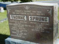 copied from original provided by Florence Chatten, June 4, 2005.12 He was buried on 11 June 1923 at Wood's Cemetery, Cramahe Twp., Northumberland Co., Ontario; Memorial: (See Exhibit) Thomas I. Thorne 1847 - 1923; Ida Chatterson his wife 1865 - 1920; THORNE; Clarence E. 1880 - 1956; His Wife; Addie Macklam 1881 - 1963; Their Infants; Muriel 1906 - 1906; Grenville 1908 - 1909; Their Son; Donald O. 1910 - 1997; His Wife; Hilda Barwise 1919 - ; SPRUNG; Morden C. 1877 - 1947; His Wife; Nellie Thorne 1884 - 1967; Their Son; Wilfred 1906 - 1988 (Woods Cemetery, Cramahe Twp., Jul 3 2004) Per Death Reg'n.1,2
