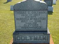 Thomas Gary Coltman was born on 6 November 1851 at Ameliasburgh Twp., Consecon, Prince Edward Co., Ontario; Date 1851 per Burial. Date 1851 & location Consecon per Death Reg'n. Date Nov 6 1851 per 1901 Census. Date Nov 1852 per 1911 Census. Date 1852 & location Ont. per 1891 Census. Date 1853 & location Ontario per 1881 Census. Date 1851 & location UC per 1861 Census. Date 1852 & location Ameliasburgh Twp. per marr. reg'n.1,3,4,5,6,2,7,8 He appeared on the census of April 1861 at Murray Twp., Northumberland Co., Ontario; Age 10 at 1861 Census: see William Coltman.2 He lived on 22 March 1877 at Murray Twp., Northumberland Co., Ontario; Residence Murray Twp. per marr. reg'n.8 He married Rebecca Ann McMasters, daughter of George McMaster and Maria Potts, on 22 March 1877 at Trenton, Hastings Co., Ontario; Marriage Reg'n.#003740: Groom: Thomas G. Coltman; Age: 25; Res.: Murray Twp; Born: Ameliasburh Twp; Status: bachelor; Occ.: farmer; Parents: William & Alvira Coltman; Bride: Rebecca McMasters; Age: 18; Res. & Born: Brighton Twp; Status: spinster; Parents: George & Maria McMasters; wit.: Maria E. Young & Elizabeth Asseltine, Trenton; Date: Mar 22 1877; Place: Trenton; Rel.: CM; Performed by: Rev. William Young; Reg'r.: Juh Simmons, Trenton (Ontario Marriage Registration, #003740-1877, ancestery.com) per 1881 Census.9 Thomas Gary Coltman appeared on the census of April 1881 at Chatham, Kent Co., Ontario; Age 28 at 1881 Census: Coltman, Thomas, 28, b. Ont., English, married; Rebecca, 22, b. Ont., English, married; Frederick, 3 (familysearch.org.)1 He appeared on the census of April 1891 at Brighton Twp., Northumberland Co., Ontario; Age 39 at 1891 Census: Coltman, Thomas, 39, b. Ont., p.b. Ont., Meth., farmer, married; Anna, 32, b. Ont., p.b. Ont., Meth., married; Frederick, 12; Ethel, 6; Jessie, 0 (1891 Census: Brighton Twp., dist. 98, sub-dist. g-3, pg. 22, line 10 - ancestry.com.)6 He lived in April 1901 at Conc 2 Lot 23, Brighton Twp., Northumberland Co., Ontario; Residence per 1901 Census: Conc 2, Lot 23.4 He appeared on the census of April 1901 at Brighton Twp., Northumberland Co., Ontario; Age 49 at 1901 Census: Coltman, Thomas, 49, b. Ont. Nov 6 1851, Eng., Meth., farmer, married; Rebecca, 41, b. Ont. Apr 18 1859, Eng., Meth., married; Ethel, 15, b. Apr 18 1885, daughter; Jessie, 10, b. Jan 3 1891, daughter; Clifford, 6, b. May 4 1894, son (1901 Census Index & Image Online: a-3, pg. 8, line 1, T-6485.)4 He appeared on the census of June 1911 at Brighton Twp., Hilton, Northumberland Co., Ontario; Age 59 at 1911 Census: Coltman, Thomas, 59, b. Ont. Nov. 1852, Scot., Meth., farmer, married; Rebecca, 52 b. April 1859, Scot., Meth., married (Conc 2, Lot 23) (1911 Census Image from Archives Canada Web site: Hilton, page 9, line 42.)5 He lived in June 1911 at Conc 2 Lot 23, Brighton Twp., Northumberland Co., Ontario; Residence per 1911 Census: Conc 2, Lot 23, Brighton Twp.5 He lived on 13 July 1916 at Murray Twp., Smithfield, Northumberland Co., Ontario; Informant for Death Reg'n. of his wife Rebecca Ann (McMasters) Coltman.7 He died on 3 January 1917 at Conc 2 Lot 24, Brighton Twp., Northumberland Co., Ontario, at age 65; Death Reg'n.#022633: Name: Thomas Coltman; Date: Jan 3 1917; Age: 66; Res.: Conc 2, Lot 24, Brighton Twp; Born: Consecon; Status: widower; Burial: Brighton; Parents: William Coltman & Elvira Butler; Cause: cancer, 6 mo; Phys.: Dr. E. A. McQuade; Inf.: Fred Coltman, Brighton; Reg'd.: Jan 4 1917; Reg'r.: Fred O. Wade (Ontario Death Registration, #022633-1917, ancestry.com) Date 1917 per Burial.3,10 He was buried on 5 January 1917 at Carman Cemetery, Brighton Twp., Carman, Northumberland Co., Ontario; Memorial: (See Exhibit) Thomas C. Coltman; 1851 - 1917; His Wife; Rebecca McMasters; 1857 - 1916; Their Son; Clifford; 1894 - 1903; COLTMAN (Carman Cemetery, Brighton Twp., June 26, 2005.)3,7