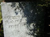 Vernon Whaley was born in 1906 at Ontario; Date 1906 per Burial.1 He was buried circa 1910 at Carman Cemetery, Brighton Twp., Carman, Northumberland Co., Ontario; Memorial: (See Exhbit) Vermon Whaley 1906 ...; Also Infants 1914 & 1920?; Infanct Freeman ??? (Carman Cemetery, Brighton Twp., June 26, 2005.)1 He died circa 1910 at Ontario; Date unclear per picture of stone??1