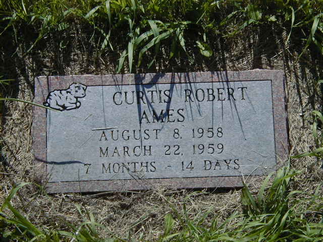 Curtis Robert Ames was born on 8 August 1958 at Birnie, Manitoba; Date Aug 8 1958 per Burial.1 He died on 22 March 1959 at Birnie, Manitoba; Date Mar 22 1959 per Burial.1 He was buried on 24 March 1959 at Birnie Cemetery, Birnie, Manitoba; Memorial: (See Exhibit) Curis Robert; Ames; August 8, 1958; March 22, 1959; 7 Months - 14 Days (Birnie Cemetery, Birnie, Manitoba, July 14, 2005.)1