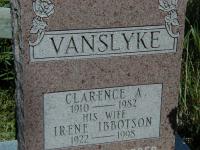 Clarence A. Vanslyke was born in 1910; Date 1910 per Burial.1 He married Irene Ibbotson, daughter of Richard Ibbotson and Eva Matterson, in September 1957 at Ontario; "Ibbotson, Irene, married Clarence VanSlyke, issue Sept 26, 1957" from Tentonian Index, Trenton Public Library. per Memorial.1,2 Clarence A. Vanslyke was buried in 1982 at Carman Cemetery, Brighton Twp., Carman, Northumberland Co., Ontario; Memorial: (See Exhibit) VANSLYKE; Clarence A; 1910 - 1982; His Wife; Irene Ibboston; 1922 - 1998 (Carman Cemetery, Brighton Twp., June 26, 2005.)1 He died in 1982 at Ontario; Date 1982 per Burial.1